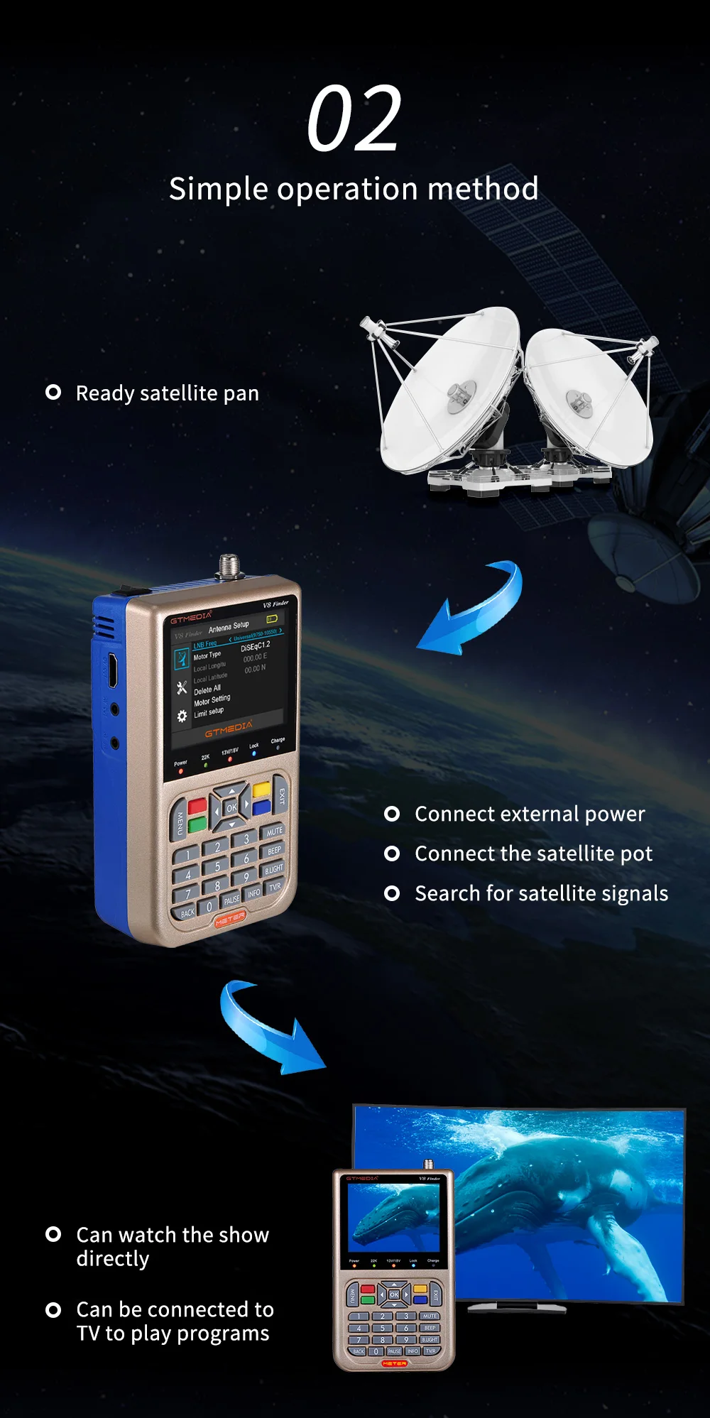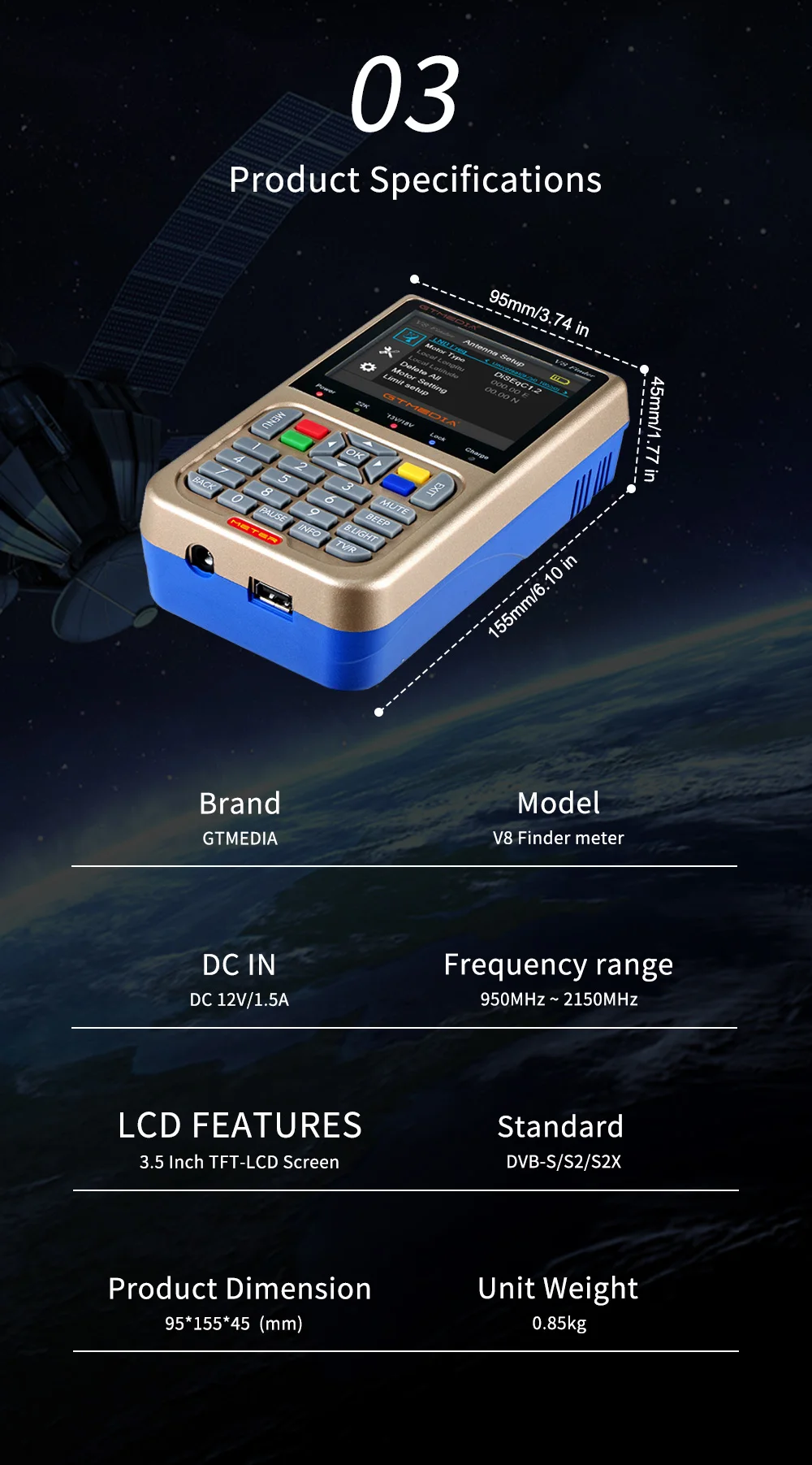 GTMEDIA V8 Finder2-это DVB-S/S2 и MPEG-2/4 H.264(8 бит) совместимый портативный спутниковый счетчик. Благодаря компактному размеру, легкому весу, интуитивно понятному интерфейсу пользователя, долгим часам работы батареи и богатым набором функций, счетчик предоставляет все функции, необходимые для установки и проверки цифрового спутникового ТВ-сервиса для жилых домов или многожилых единиц.