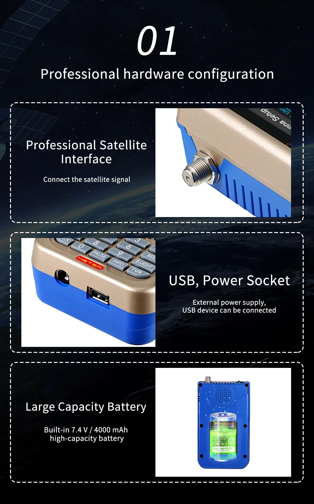 ● Цифровое измерительное устройство для повышения уровня сигнала и качества. Поддержка предварительной настройки всей спутниковой информации