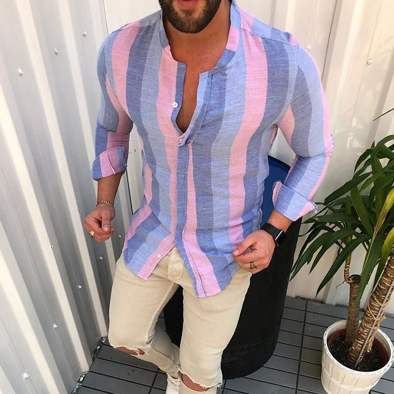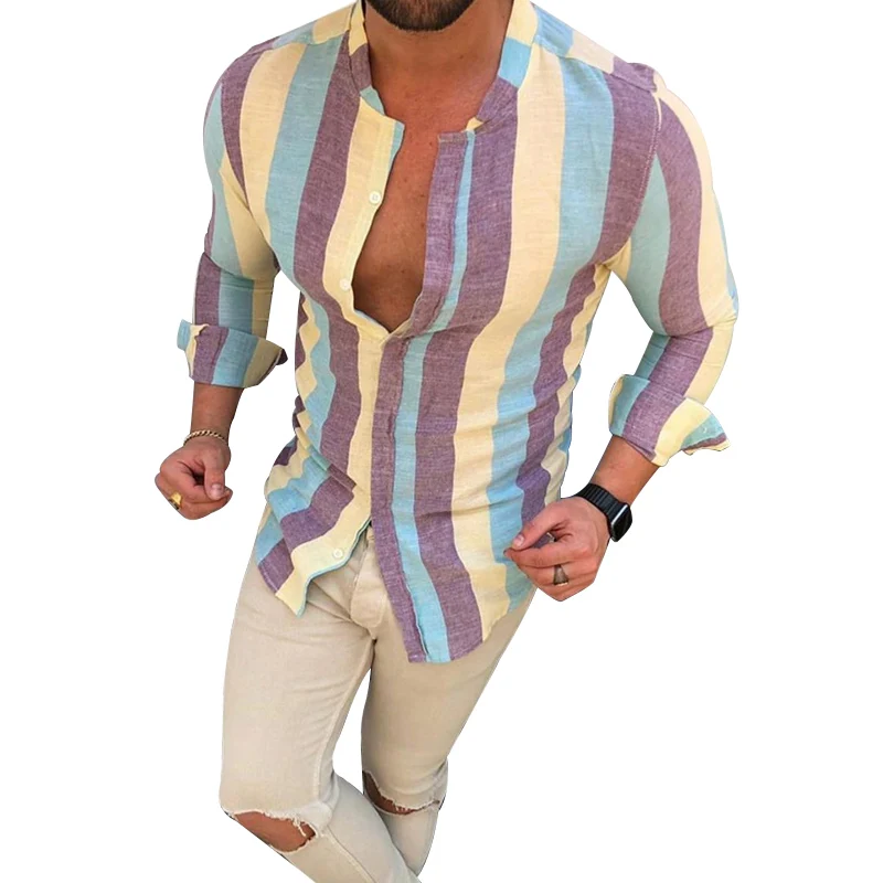 Мужская рубашка в полоску, Повседневная приталенная рубашка с длинным рукавом и квадратным вырезом