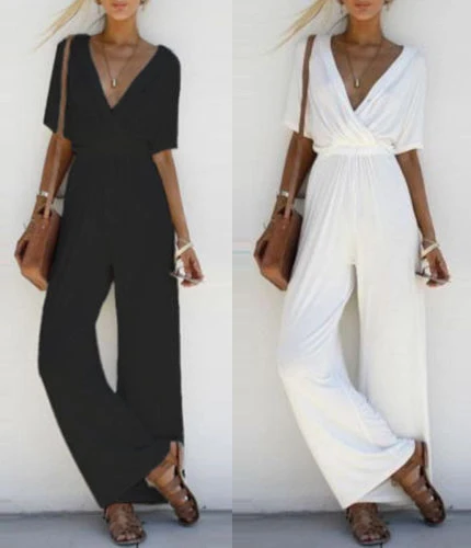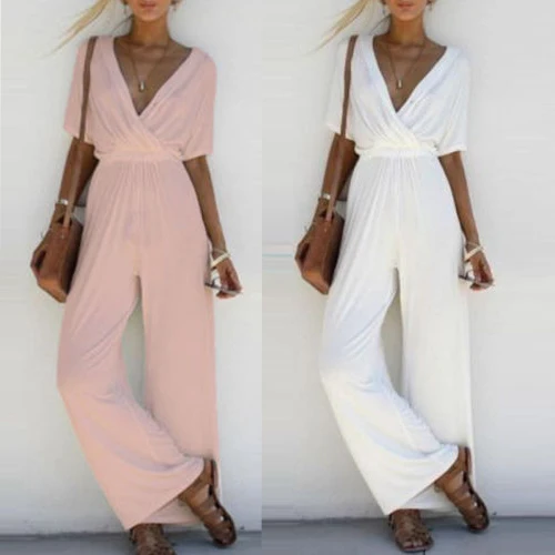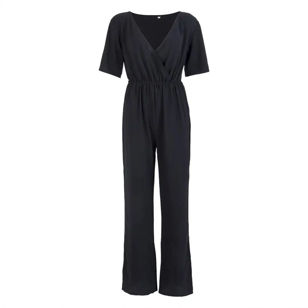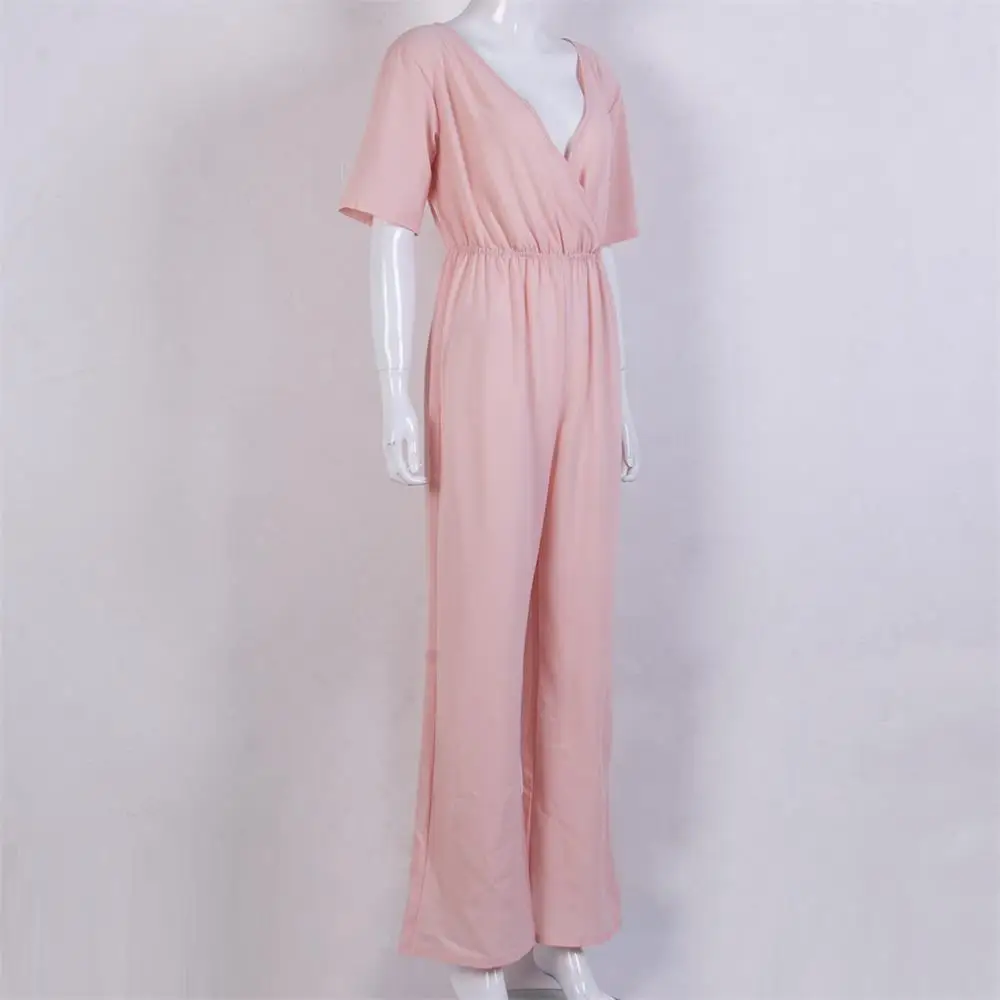 Женский комбинезон с V-образным вырезом, Облегающий комбинезон, длинные широкие брюки с коротким рукавом, повседневные свободные Женские однотонные комбинезоны