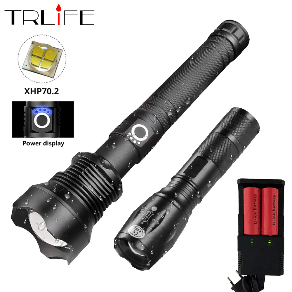 Мощный светодиодный фонарик с использованием лампы XHP70.2 светодиодный фонарь с максимальной мощностью до 65000 люменовУвеличьте 2*18650 или 2*26650 аккумуляторный отсек, чтобы увеличить время работы.Дисплей емкости аккумулятора, телескопический зумМикро-usb для компьютера usb, Автомобильный USB, usb-разъем для зарядки, зарядный фонарикИзготовлен из авиационного алюминиевого сплава прочный HAIII военный класс Жесткий анодированныйВодонепроницаемый в соответствии с IPX-6, водостойкий, может использоваться в дождливую погоду, но не может положить его в водуПодходит для работы, охоты, альпинизма, рыбалки, кемпинга и активного отдыха и т. д.Ударопрочный до 2 метров