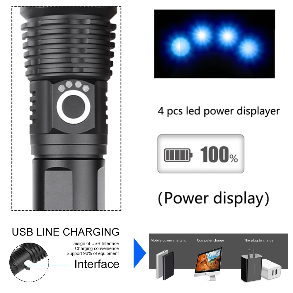 Мощный светодиодный фонарик с использованием лампы XHP50 светодиодный фонарь с максимальным выходом до 30000 люменовУвеличьте 1*18650 или 1*26650 аккумуляторный отсек, чтобы увеличить время работы.Дисплей емкости аккумулятора, телескопический зумМикро-usb для компьютера usb, Автомобильный USB, usb-разъем для зарядки, зарядный фонарикИзготовлен из авиационного алюминиевого сплава прочный HAIII военный класс Жесткий анодированныйВодонепроницаемый в соответствии с IPX-6, водостойкий, может использоваться в дождливую погоду, но не может положить его в водуПодходит для работы, охоты, альпинизма, рыбалки, кемпинга и активного отдыха и т. д.Ударопрочный до 2 метров