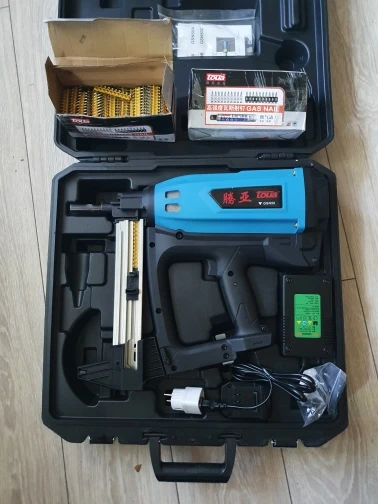 1 * пистолет для ногтей + 1 * аккумулятор + 1 * держатель + 1 * сумка + 2 * гвоздь (коробка) + 1 * очки + детали для инструментов