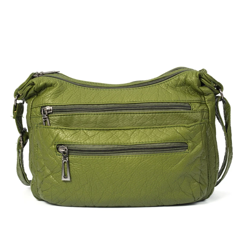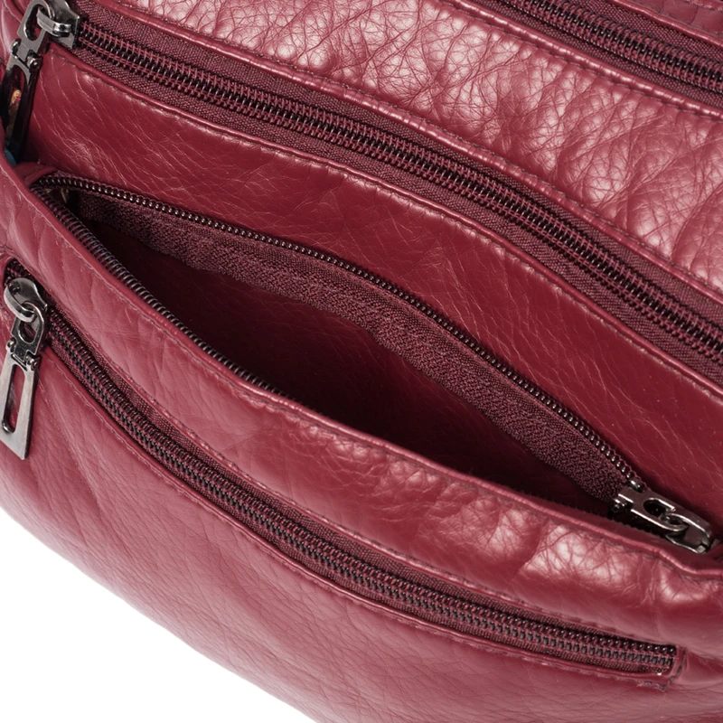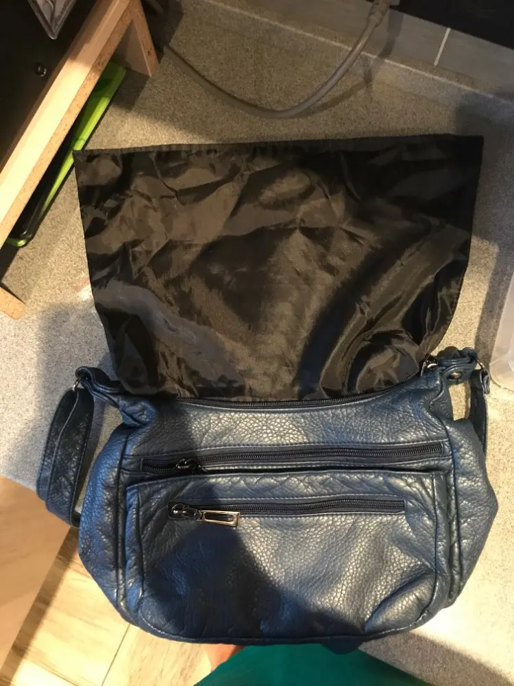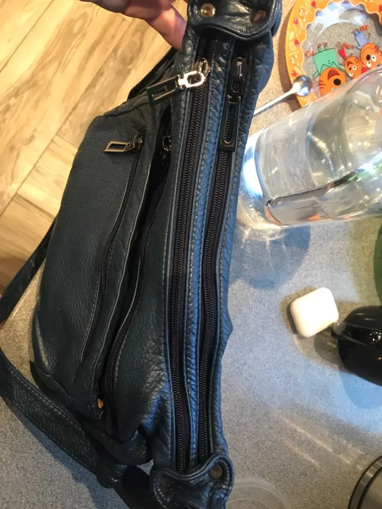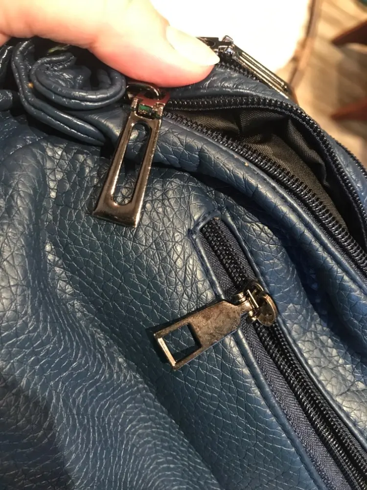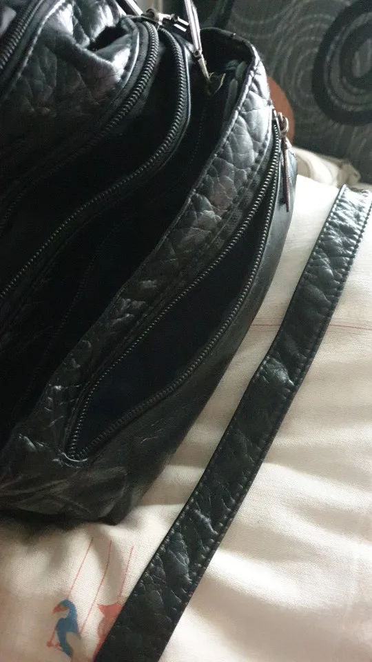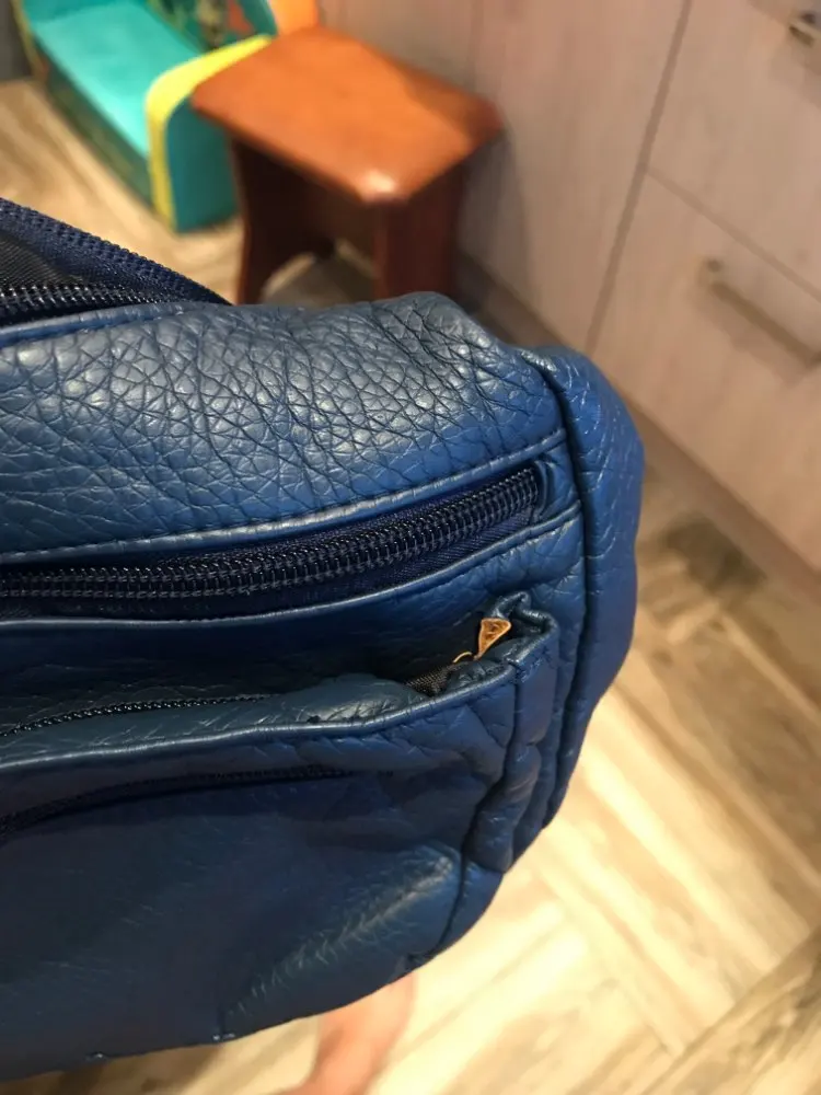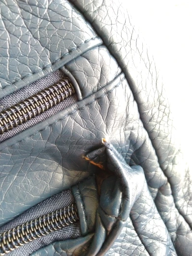 Люблю сумки из такой кожи но эта оказалась оч среднего качества пошива. Бегунок на молнии на заднем кармане вообще другой, и старый затертый. Все молнии вшиты криво и идут волной. Внутренний подклад намного больше чем нужно и лежит кучей внутри сумки. В самом видимом кармане торчат наружу Светлые края кожи.