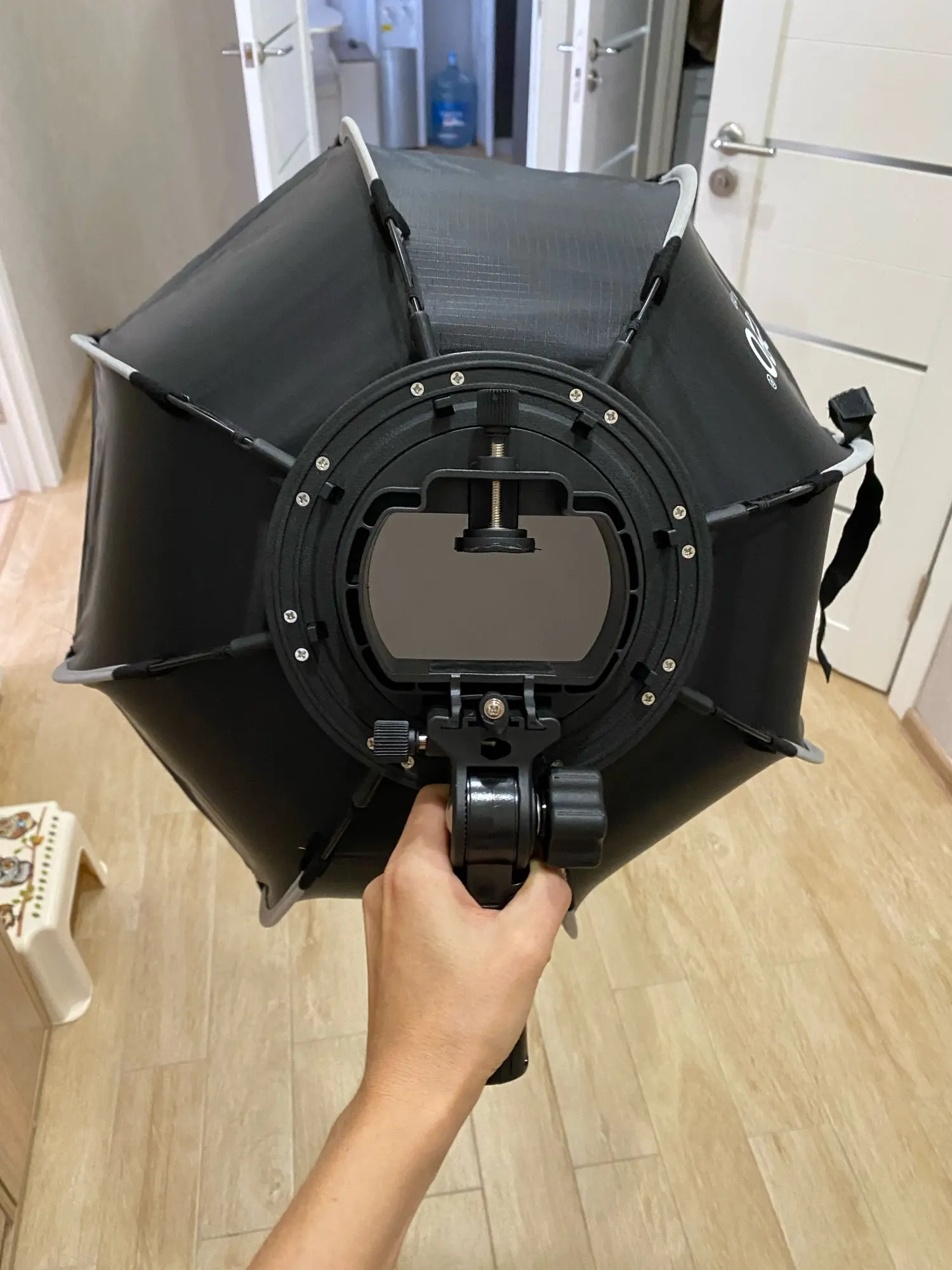 Отличный софтбокс, для мобильной съемки чуть чуть великоват но снимать можно.Сам бокс легкий с ручкой .Приехал в сроки.Все отлично.