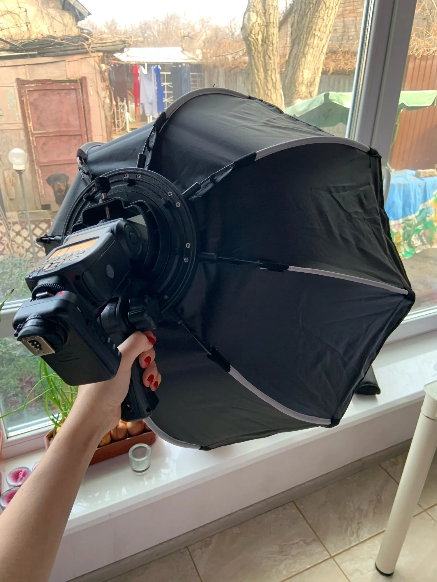 Пришёл прокуренный насквозь. пришлось денёк проветривать на балконе. рукоятка очень маленькая, упираюсь в винт. Не хватает длины, 1-2см. В остальном хороший софт бокс. Одной рукой передать очень легко. По сравнению с предыдущим, раза в 2-3 легче.