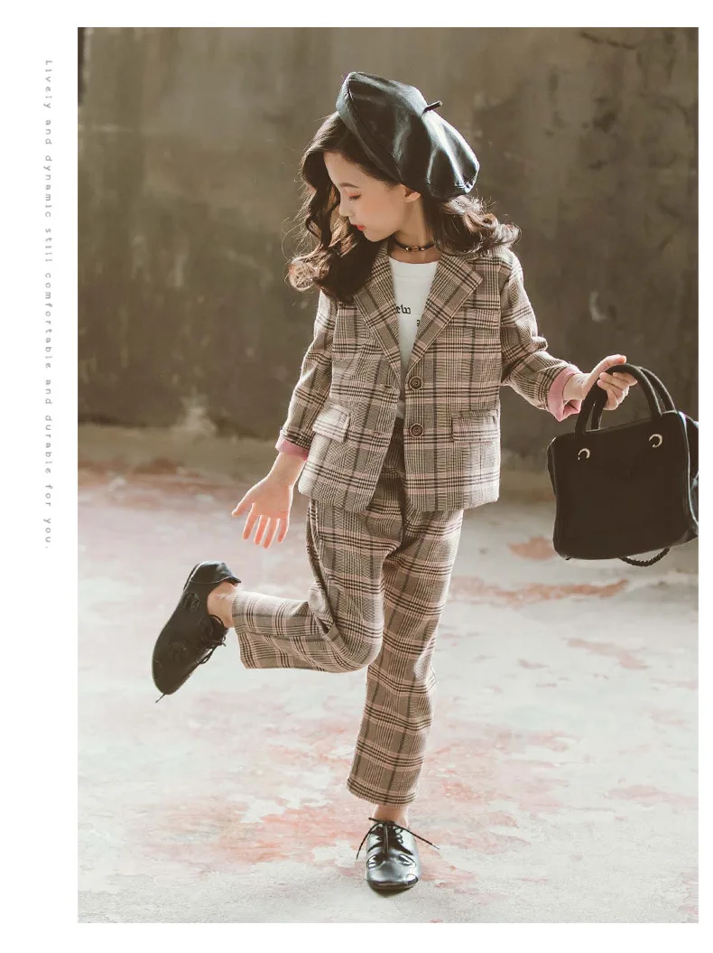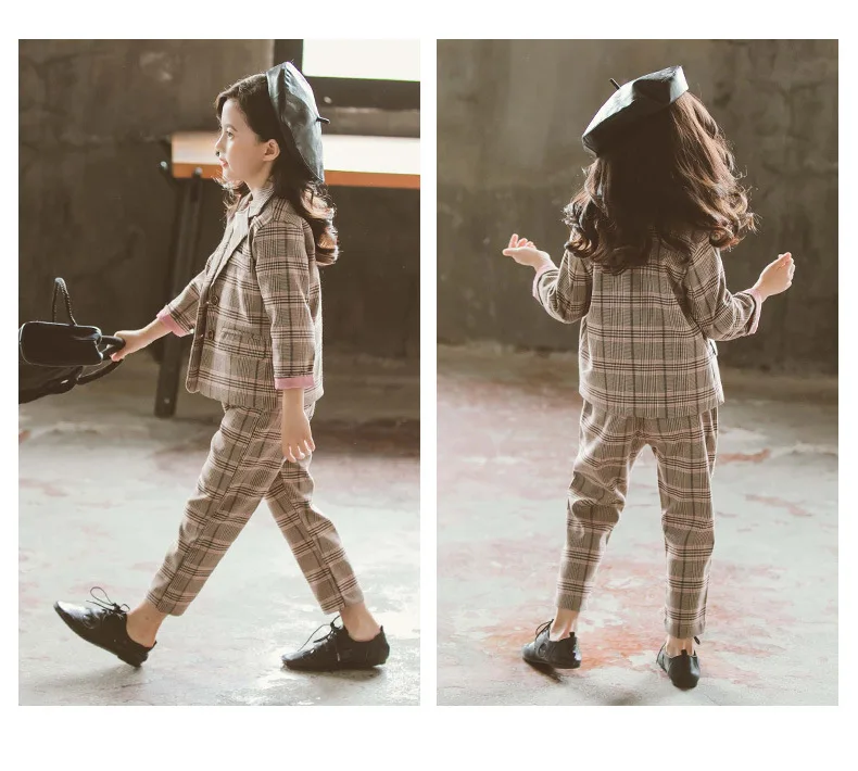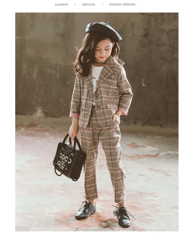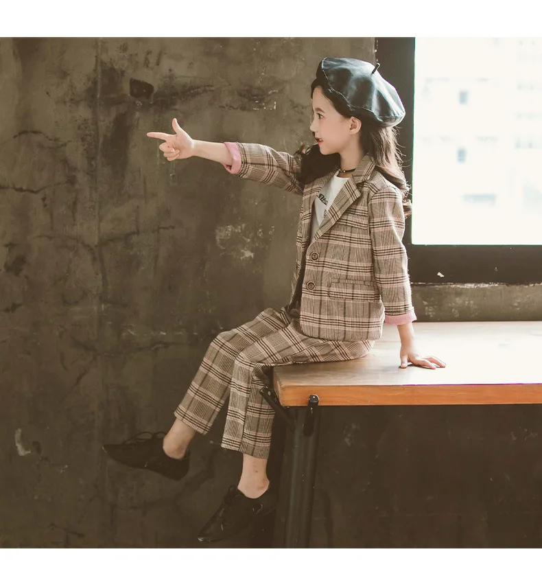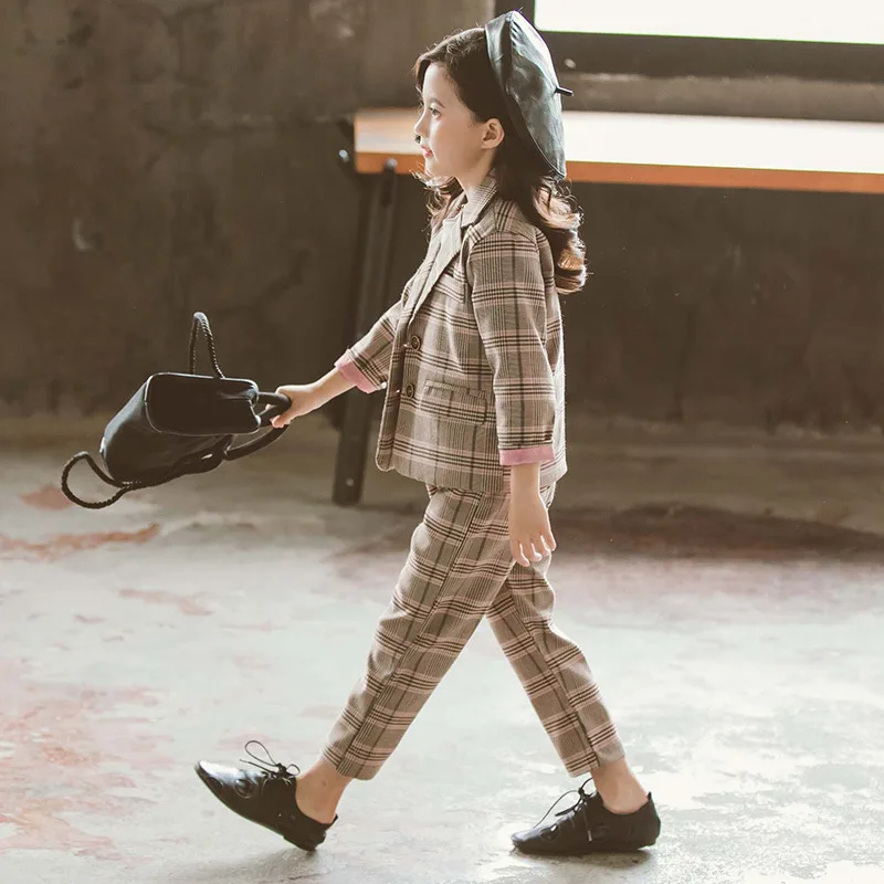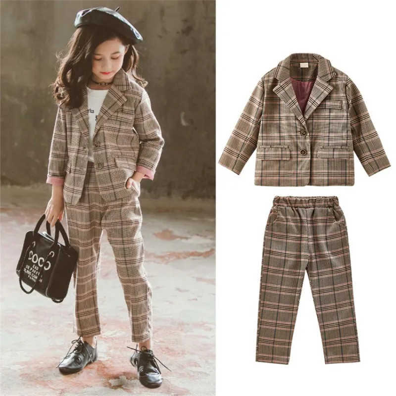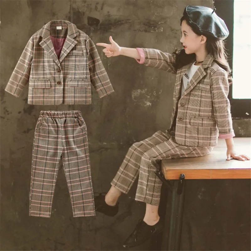 Детский комплект одежды для девочек; Весенний костюм для девочек-подростков; Клетчатая куртка; Брюки; 2 предмета; Школьный детский спортивный костюм для девочек; Официальная одежда
