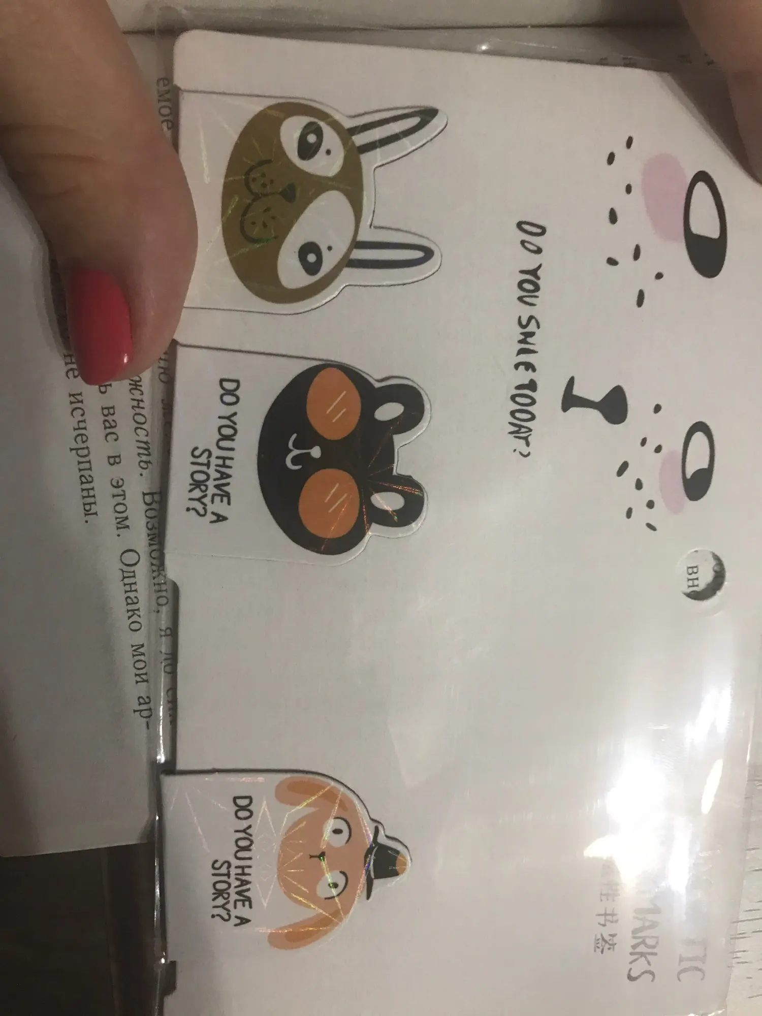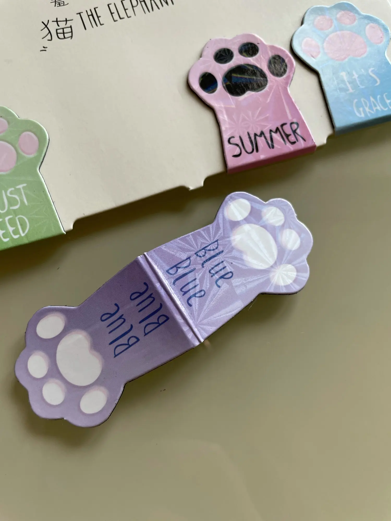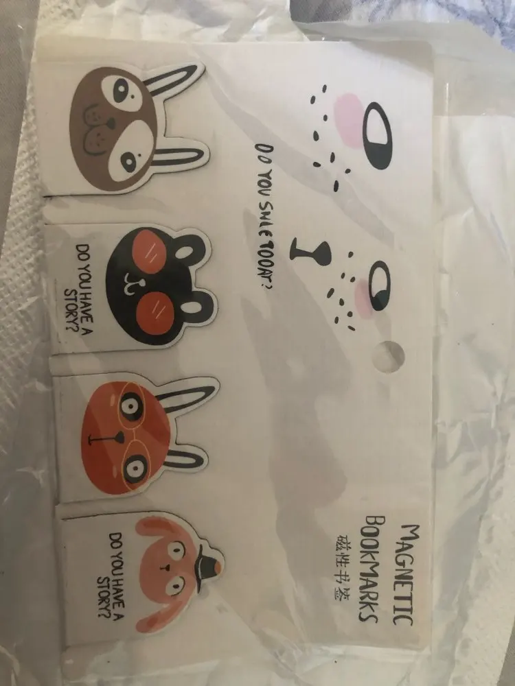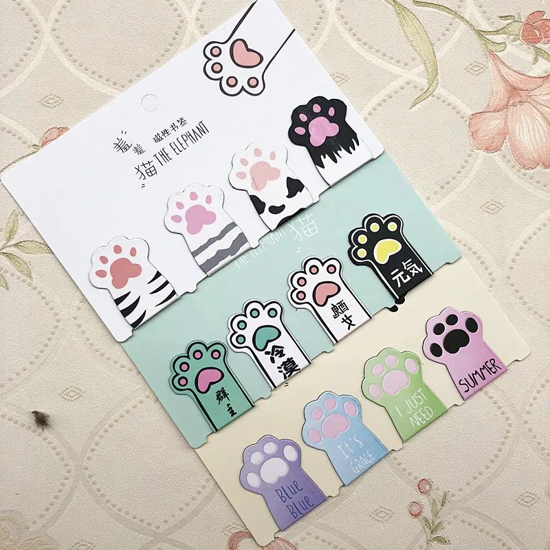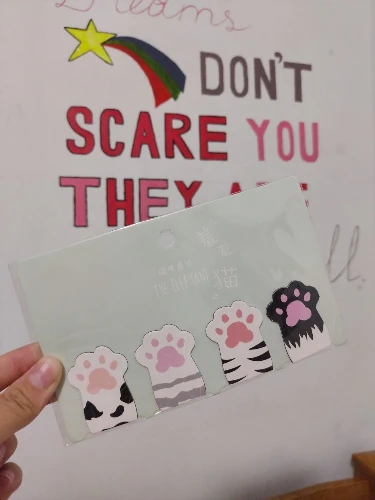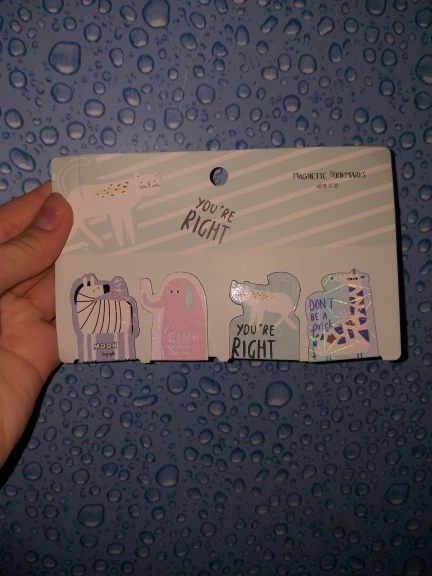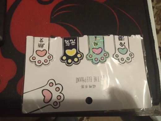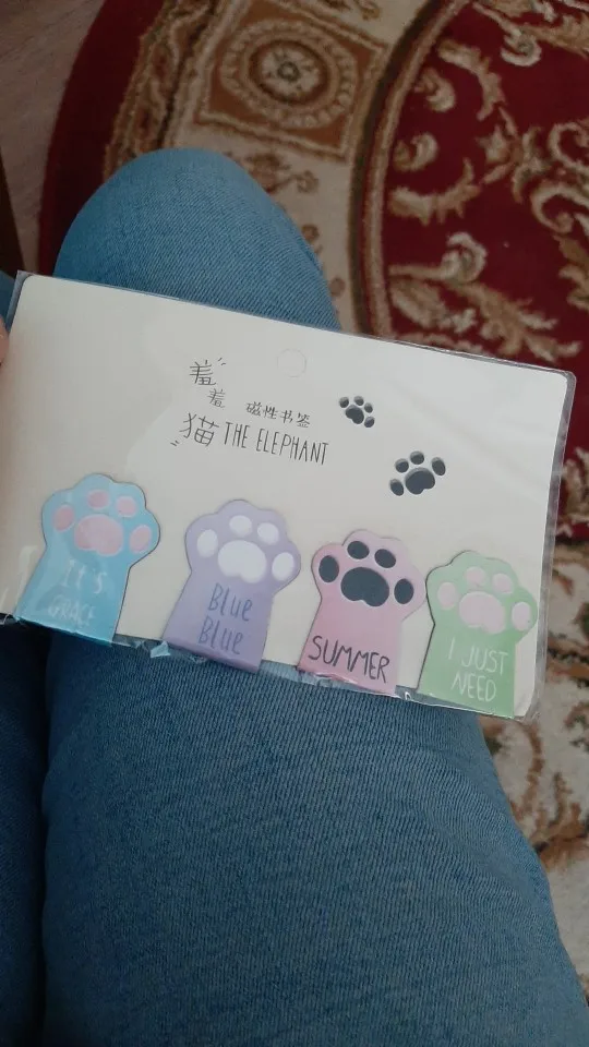 заказала 13 ноября комплект с кошачьими лапками. видела, что высылается рандомно один дизайн из 3 представленных в лоте. сразу после оформления заказа написала продавцу просьбу выслать мне чёрно-белые лапки. если не путаю, то 16 числа товар отправили, а 17 продавец ответил на мою просьбу. сказал,что товар был выслан рандомно. заказ пришел 26 ноября. по России не отслеживалась. пришел в пакете с пупырной. подложка, на которой закладки располагаются немного помялась. сами закладки не помялись. на них есть неровные края, на одной закладке есть помятость рисунка (с внутренней стороны этого нет). не понимаю смысла отправлять в Россию закладки с надписью на китайском. магниты в них разные, голубая лапка держится хуже всех. ели цепляется за 4 листов. остальные держаться лучше.