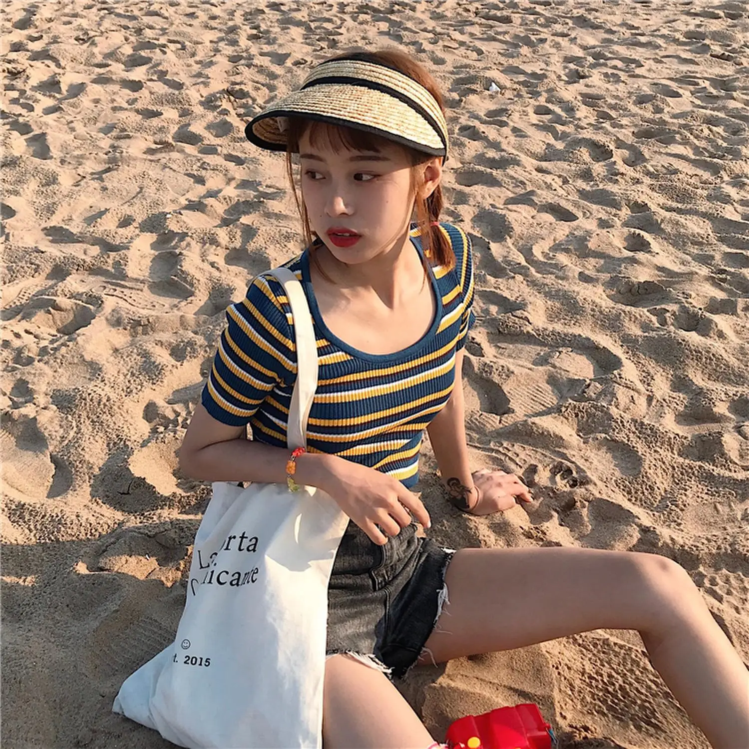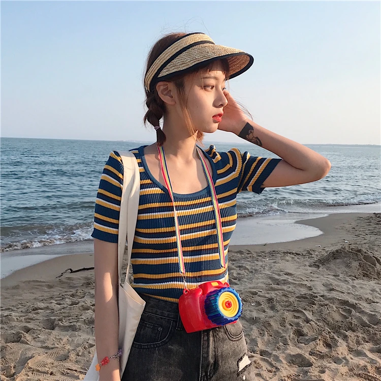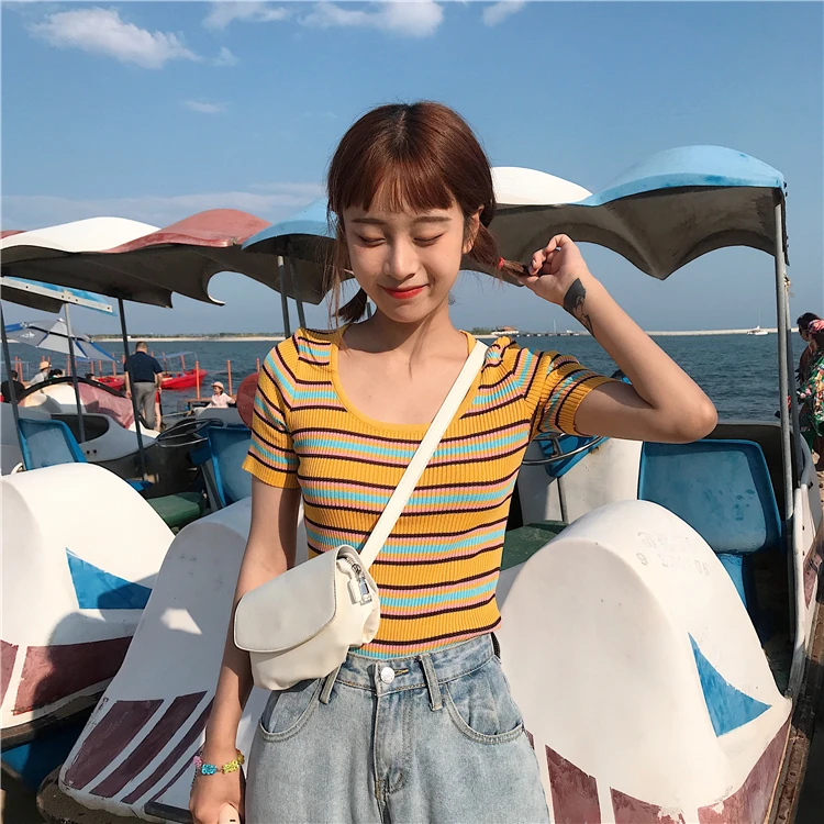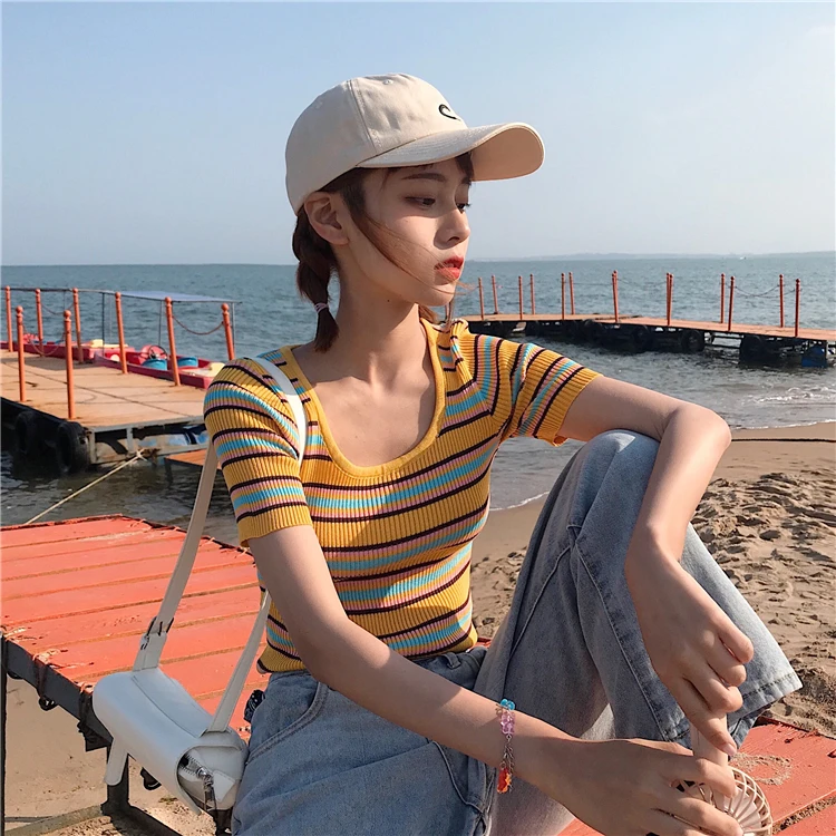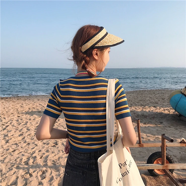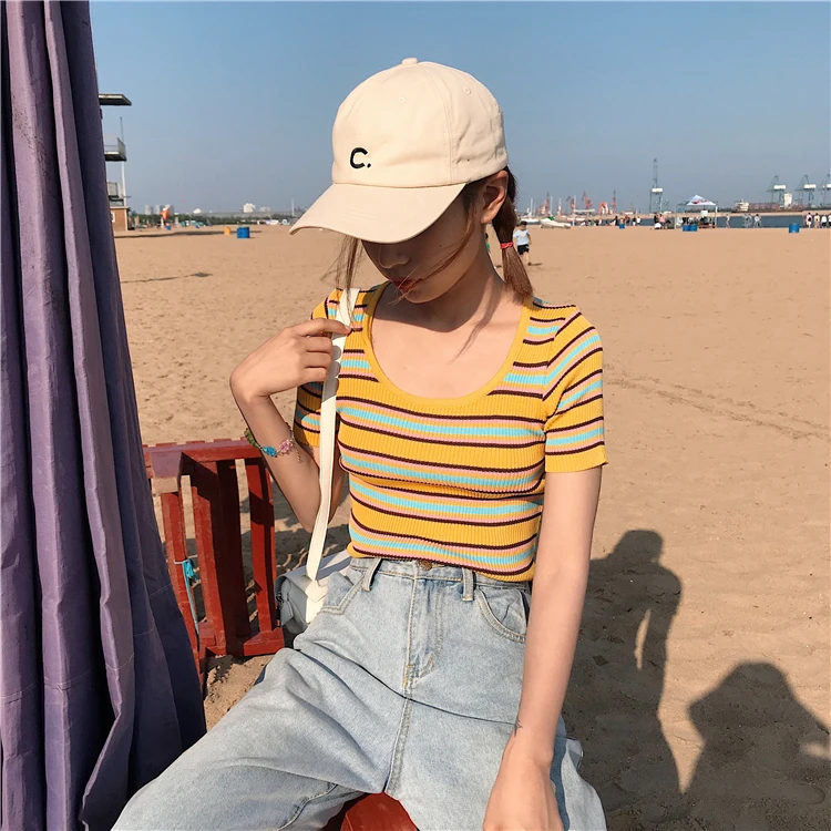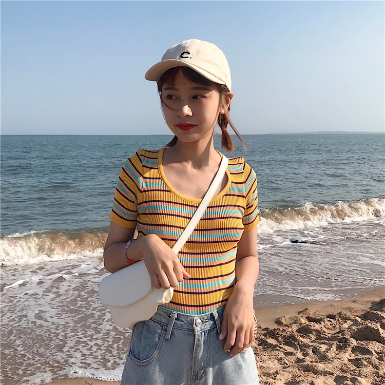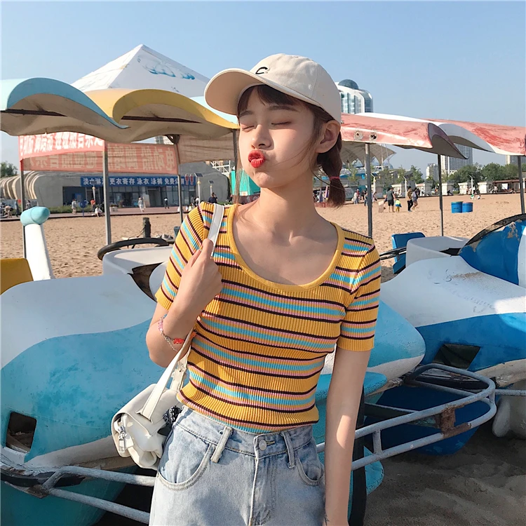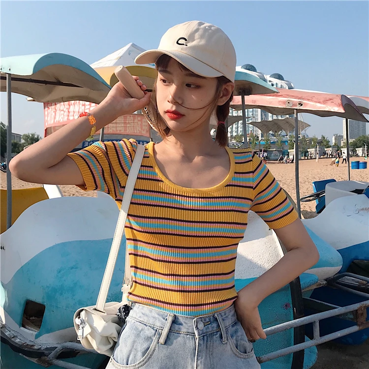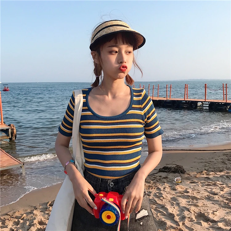 Женская трикотажная футболка в полоску с круглым вырезом и короткими рукавами, облегающие Топы контрастных цветов