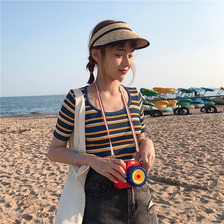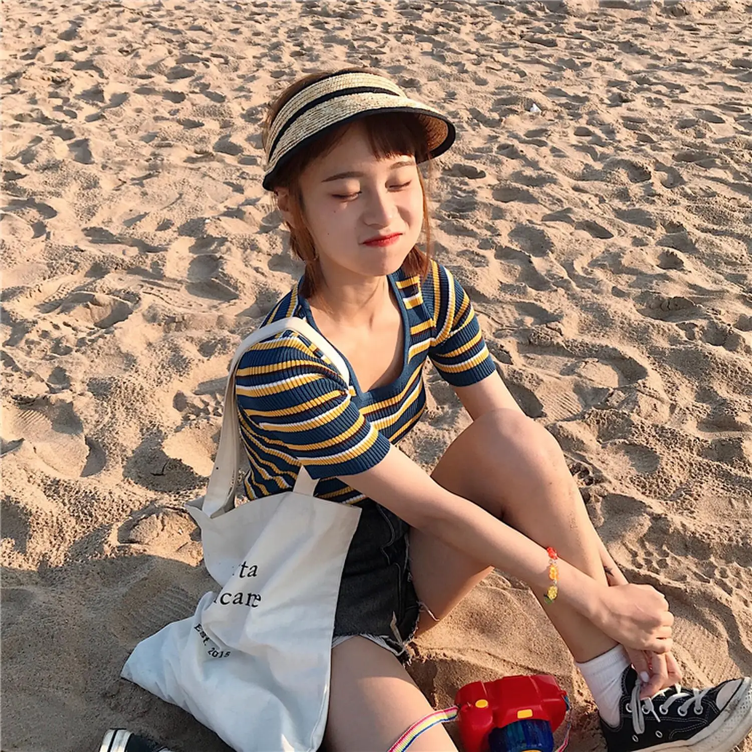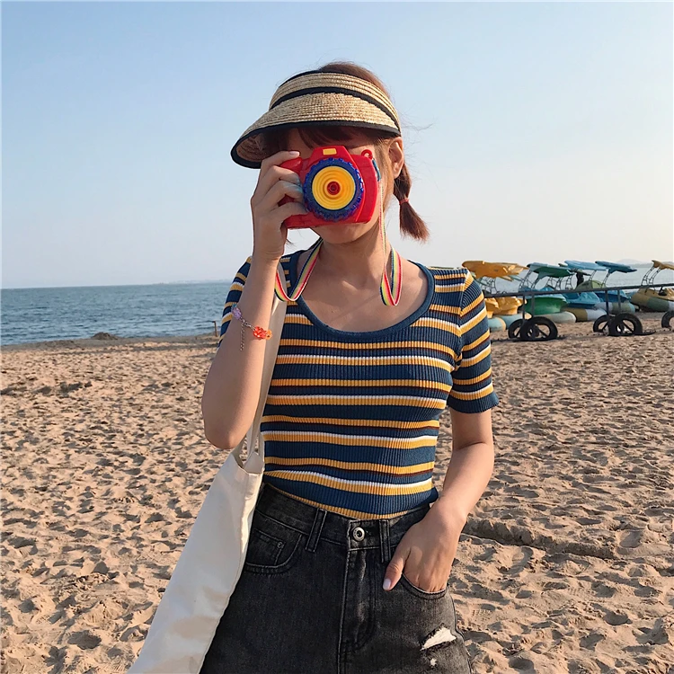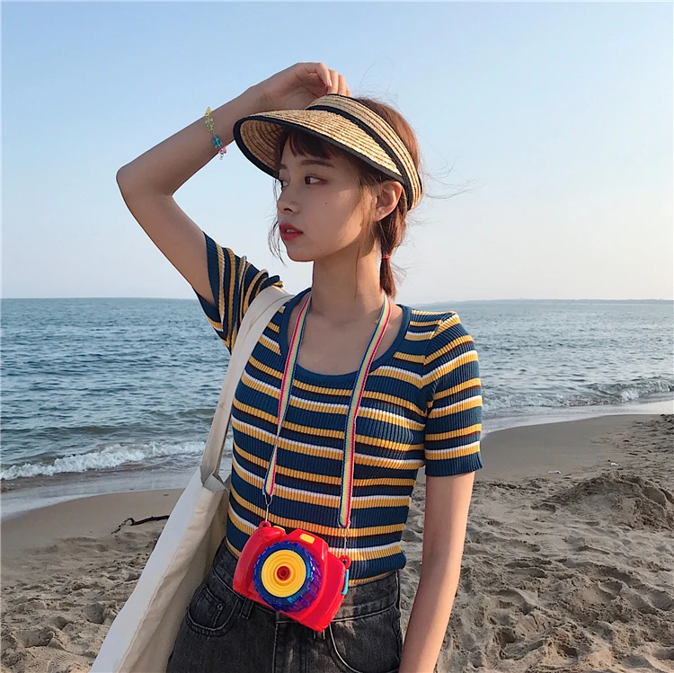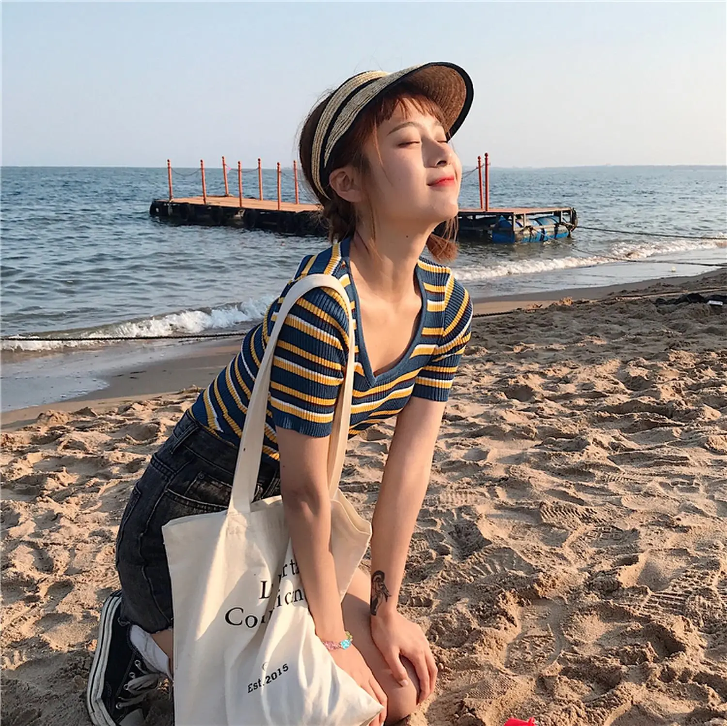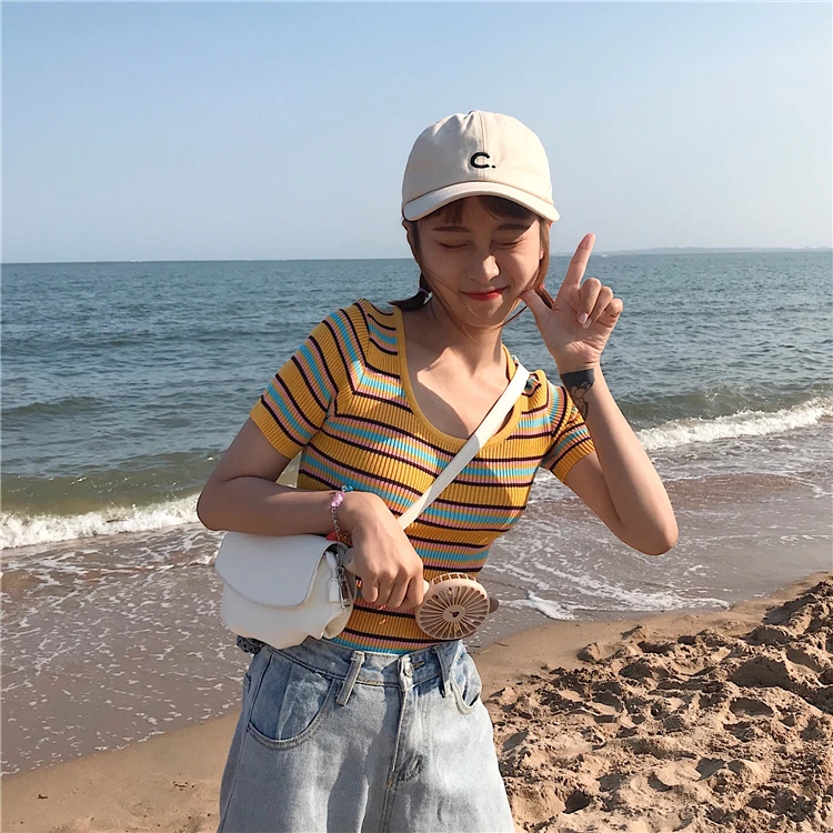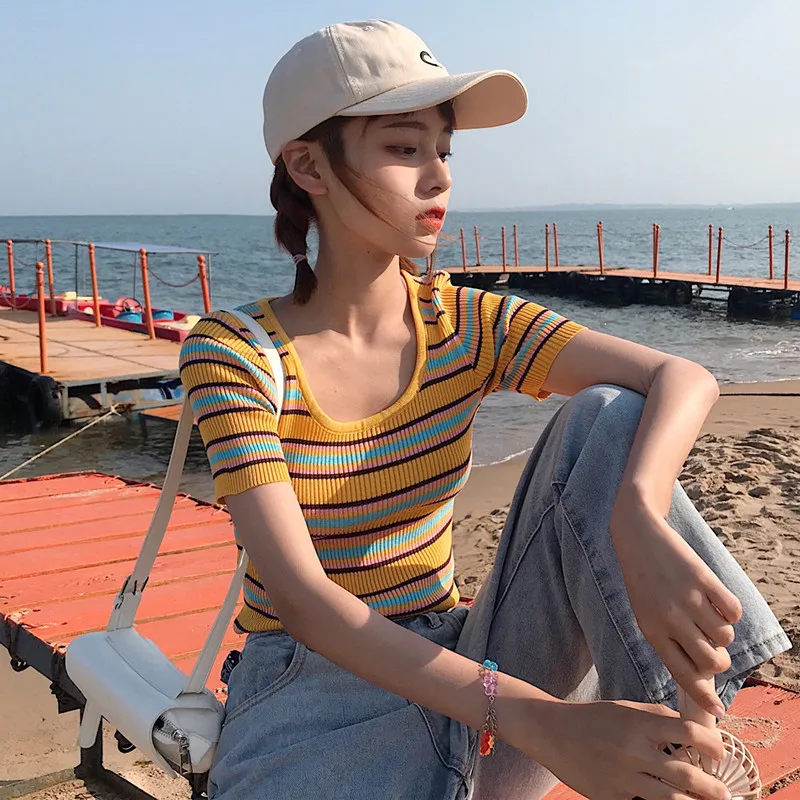 Женская трикотажная футболка в полоску с круглым вырезом и короткими рукавами, облегающие Топы контрастных цветов