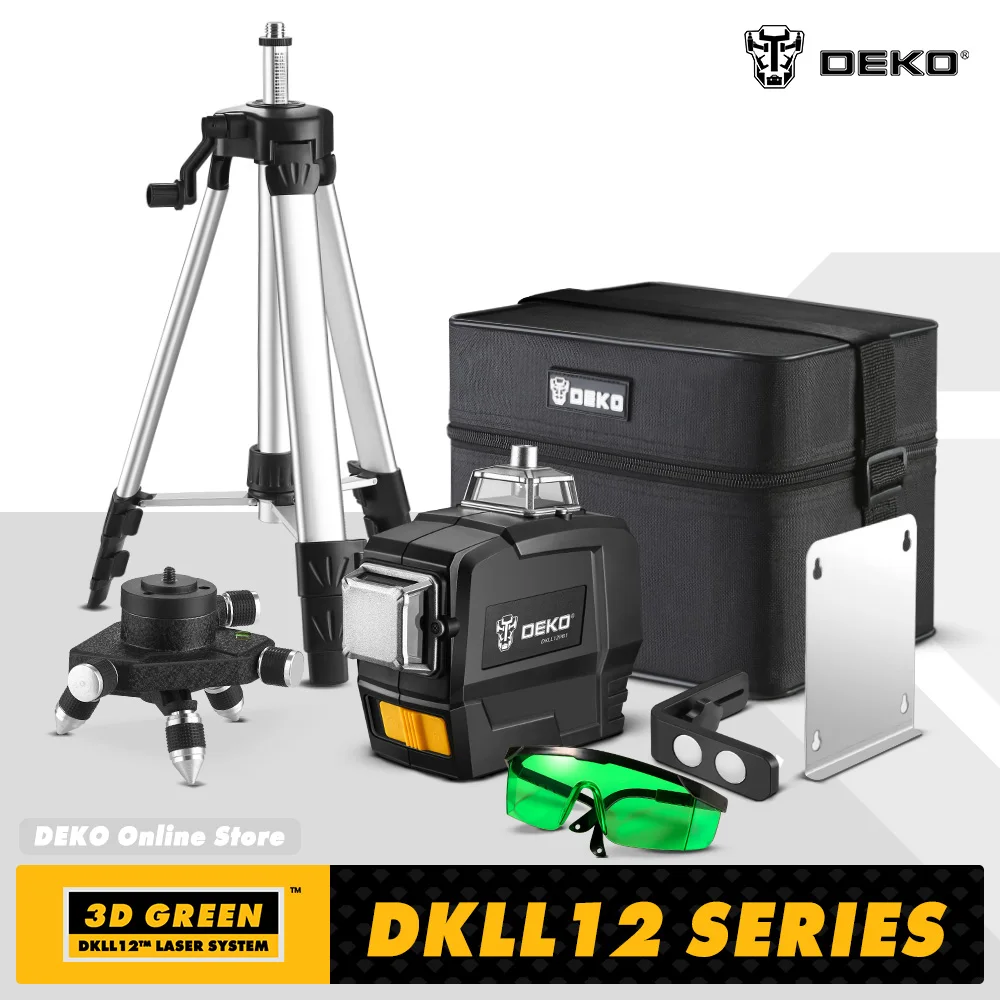 Лазерный уровень DEKO DC, поворотный самонивелирующийся нивелир с 12 вертикальными и горизонтальными линиями зеленого цвета для помещений и улицы, вращение на 360 градусов