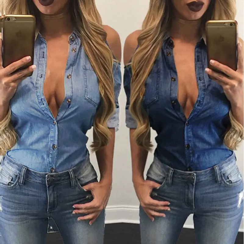 Женская джинсовая рубашка с V-образным вырезом и коротким рукавом