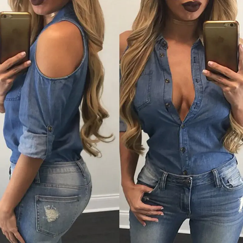 Женская Джинсовая блузка, винтажная Повседневная Свободная блузка с длинным рукавом, отложным воротником и открытыми плечами на лето, Лидер продаж