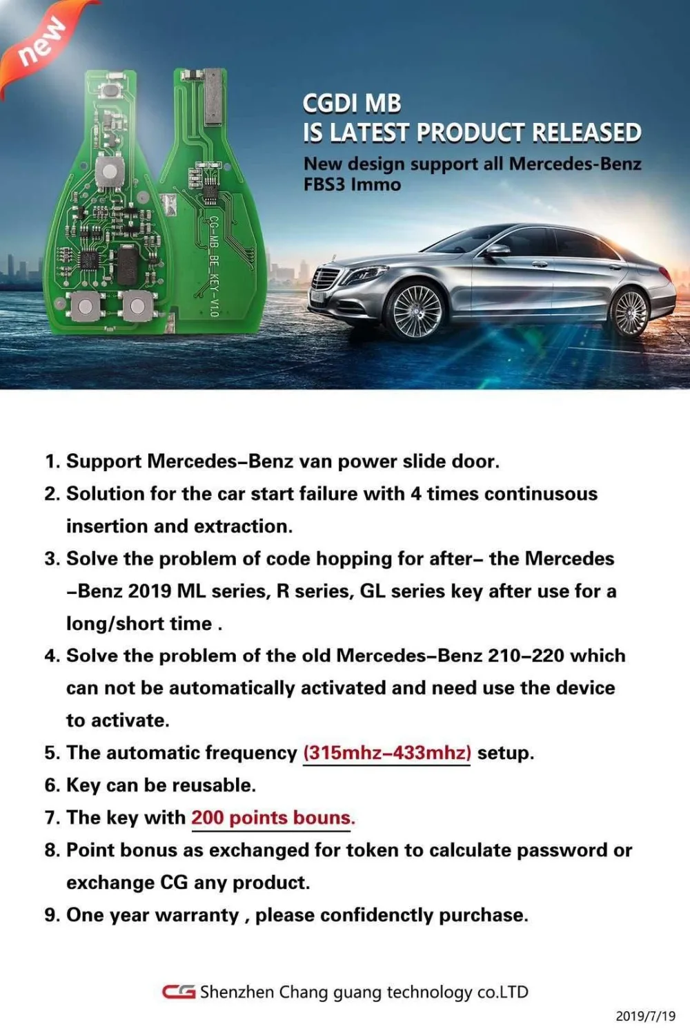 Highlighst CGDI MB Be Key:1. Поддержка всех FBS32. Никогда Не теряйте синхронизацию3. Поддержка автоматического восстановления4. Подходит для 208,203,215,210.220.211.209,164.221.216.166.169.639.204.207.2125. Применимые модели: W221 W216 W164 W251 после 2009 года, включая: серии S, серии ML, серии GL и серии R.6. Вы можете получить 200 бонусных баллов при использовании CGDI MB для программы этого ключа. 200 баллов = 1 маркер для CGDI MB (маркер стоимостью $4 при покупке отдельно).Для очков, если вам не нужно менять маркер, вы также можете обменять на другое устройство в интернет-магазине CGDI позже.