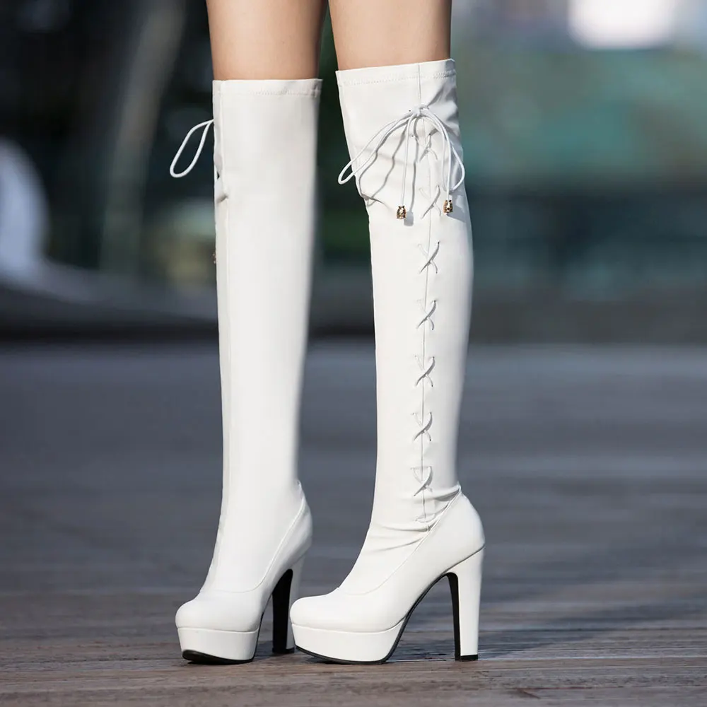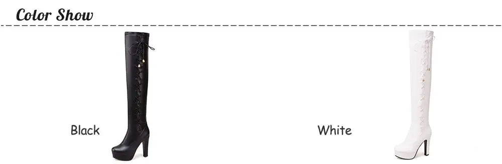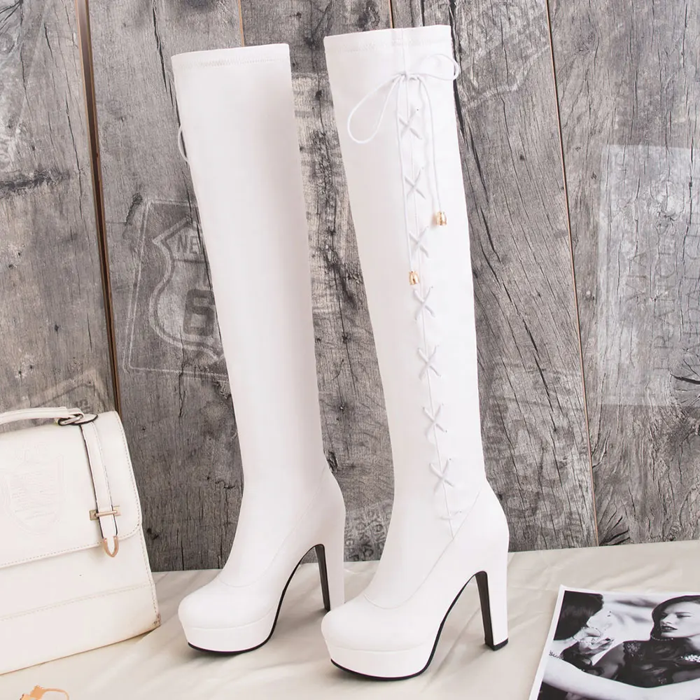 Женские сапоги выше колена, черные, белые сапоги на платформе и тон...