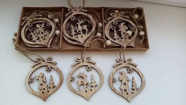 За эти деньги отличные игрушки. Заказывала 2 упаковки. Были покрашены только колокольчики в золотой. Все сделано очень аккуратно. На некоторых игрушках очень красивый ярко выраженный рисунок дерева, на других меньше. Смотрится хорошо. Доставка до Харькова 3 недели. Рекомендую к покупке.
