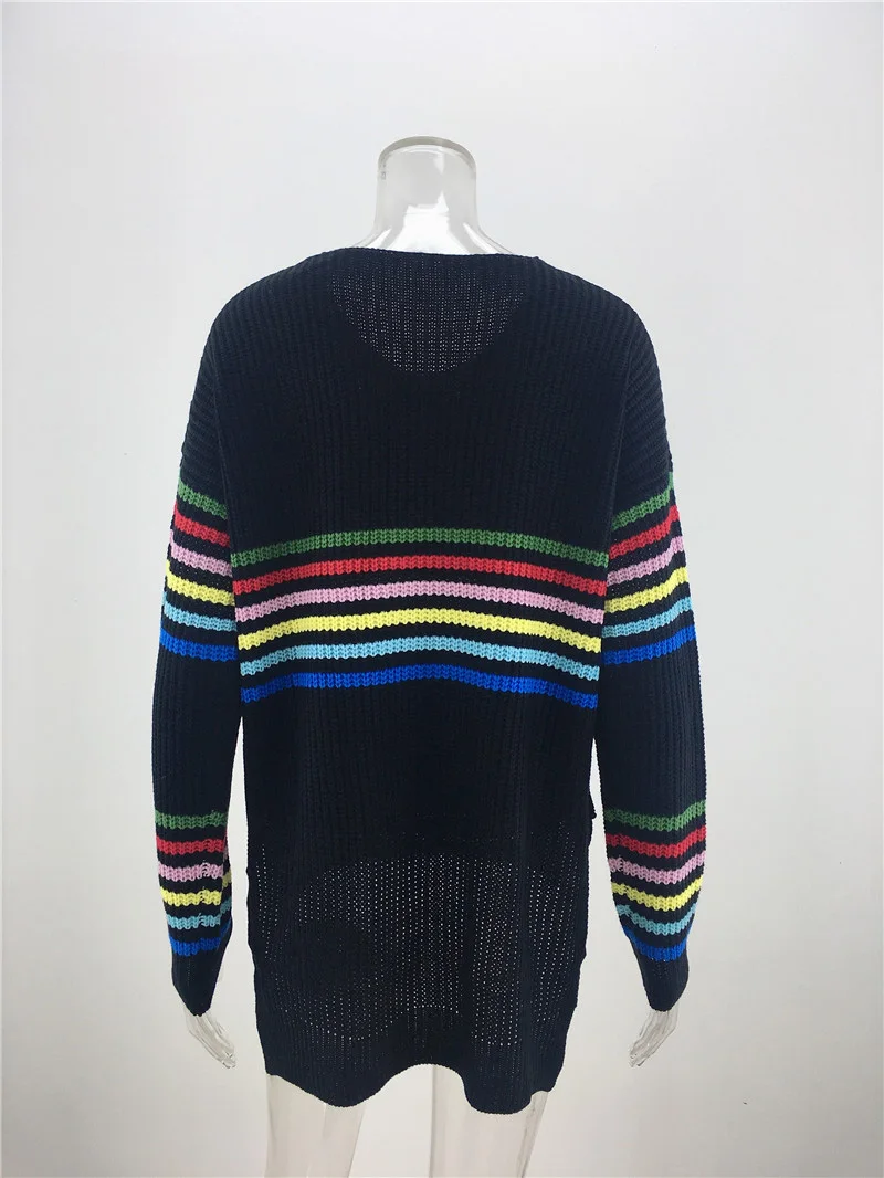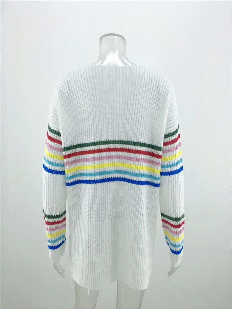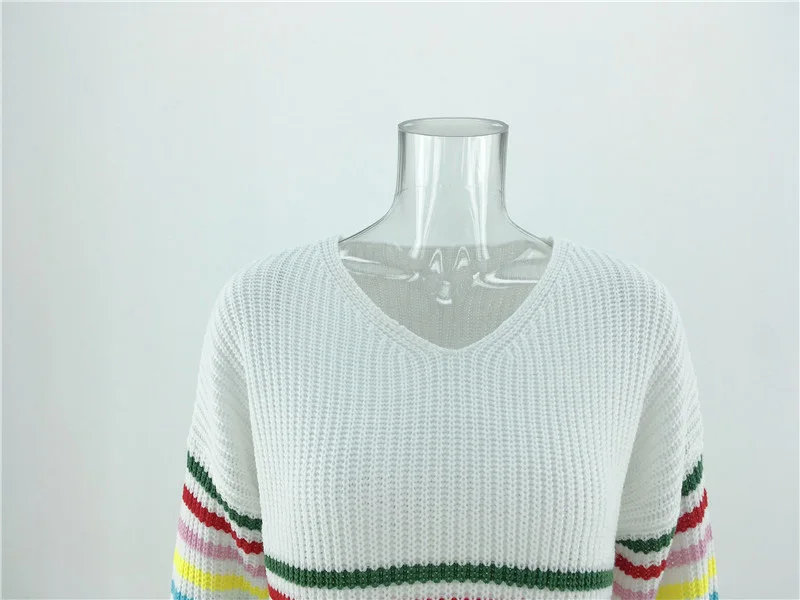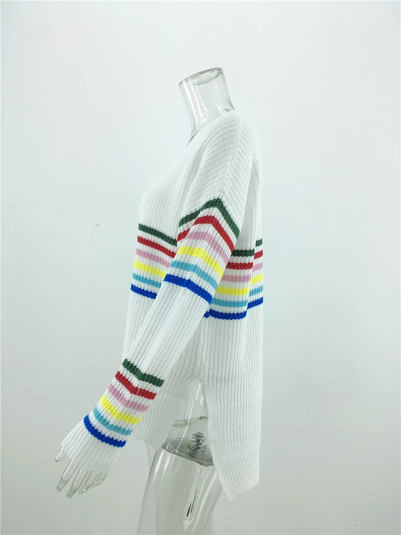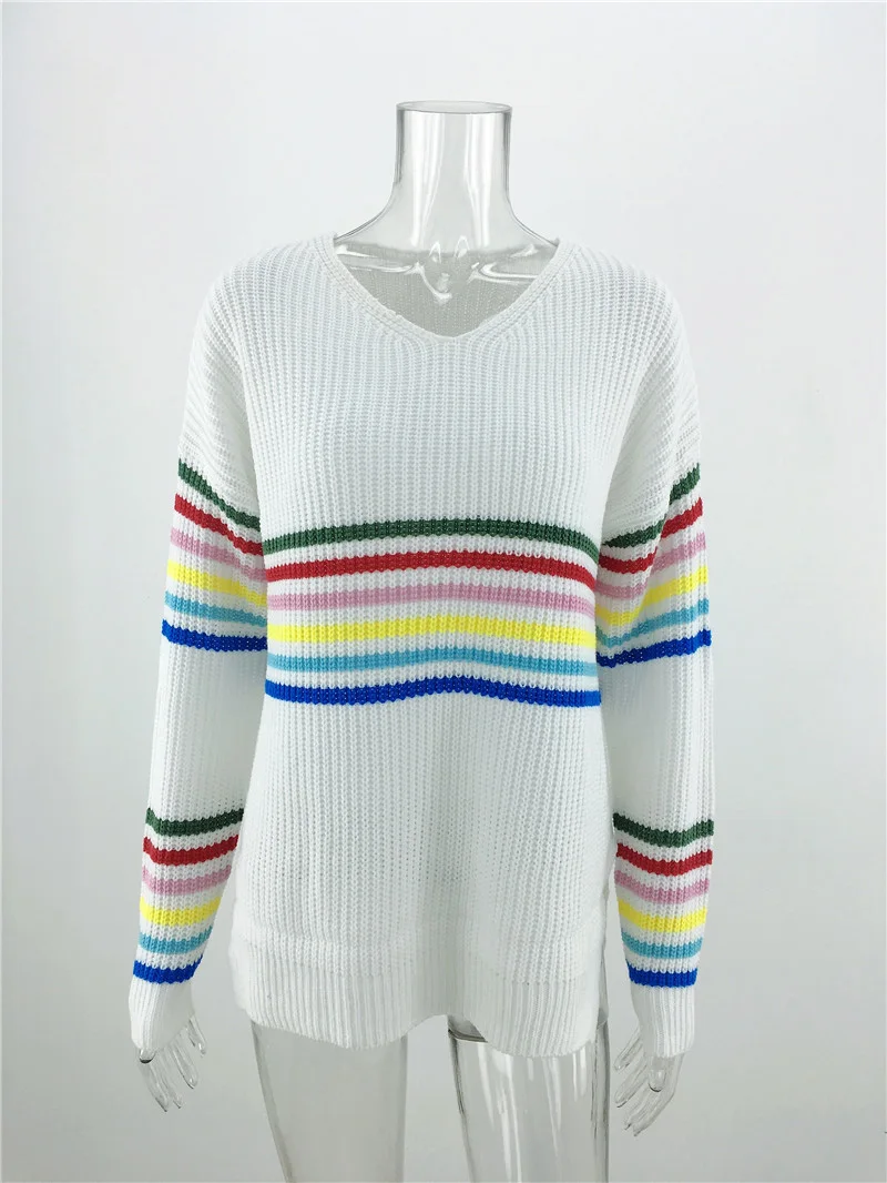 Зимние Модные женские свитера Fitshinling 2021, облегающие пуловеры в радужную полоску, вязаный джемпер в Корейском стиле, Женский пуловер с V-образным вырезом