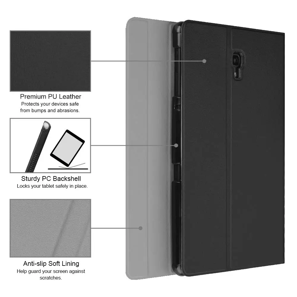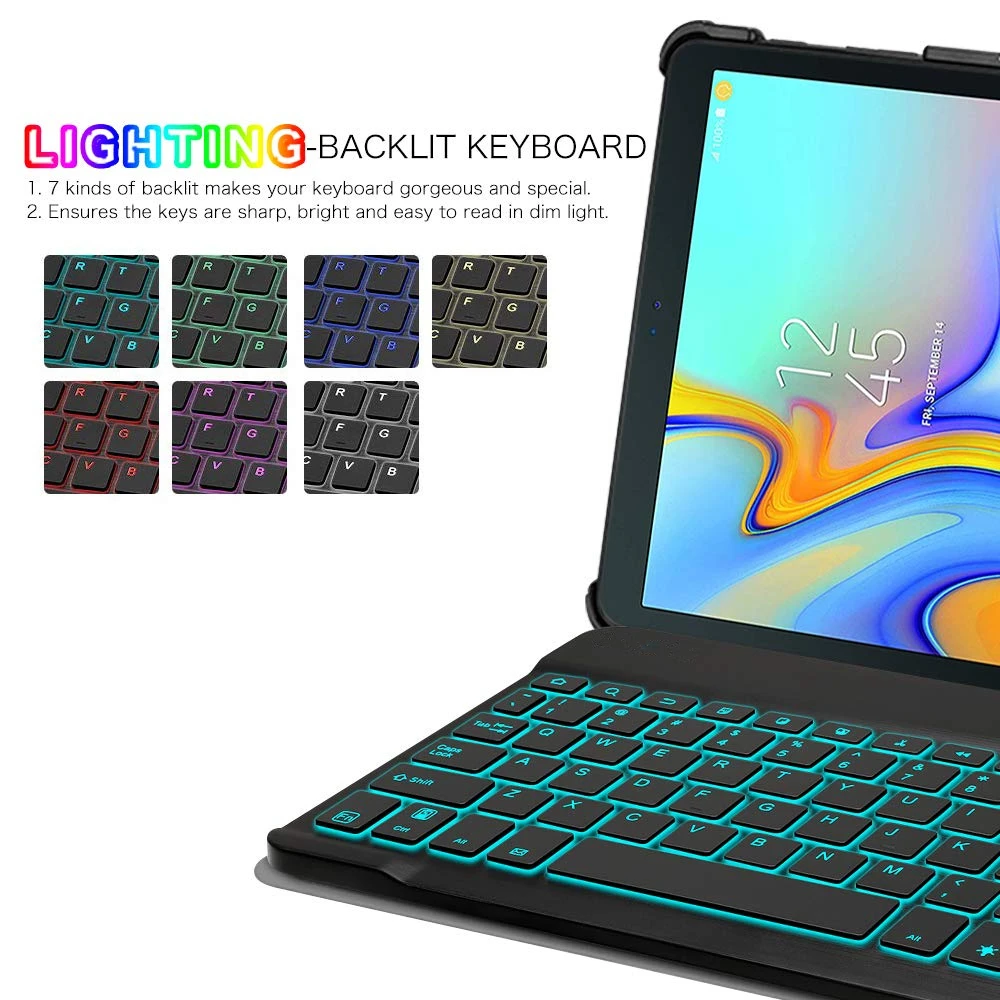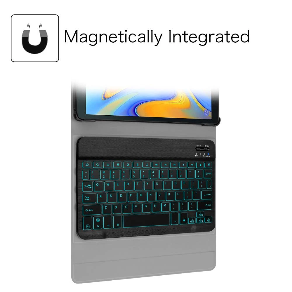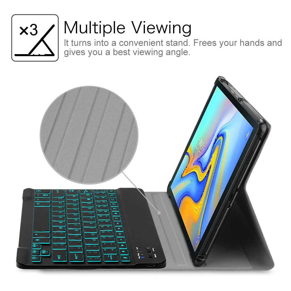 Этот чехол совместим с клавиатурой для Samsung Galaxy Tab A 10,5 2018, модель SM-T590 SM-T595, тонкий корпус, легкий чехол с подставкой, съемный планшет с клавиатурой. Он не будет работать для 2016 Galaxy Tab A 10,1 (модель: SM-T580/T585/T587/P580/P585) или любого другого модельного устройства Магнитно Отсоединяемый тонкий 7 мм светильник и вес bluetooth клавиатура с диапазоном 10 м. Умный тонкий дизайн обеспечивает максимальную защиту при минимальном объеме (0,38 дюйма) Съемная клавиатура используется в качестве части подставки для планшета. Сдвинуть клавиатуру более вперед или назад по крышку чехол, вы можете отрегулировать угол планшет к вашему предпочтению Прочный чехол из искусственной кожи и нескользящая резиновая подкладка обеспечивают полную защиту вашего планшета. Премиум поликарбонатный корпус фиксирует ваш планшет на месте и поглощает капли и удары Настоящая жесткая клавиатура для ноутбука с высококачественным АБС-материалом. Не дешевая силиконовая клавиатура, как и другие чехлы на рынке. Пружинный механизм под каждой клавишей обеспечивает тактильную реакцию с каждым ходом, помогая вам печатать быстрее и с меньшей погрешностью, чем на сенсорном экране