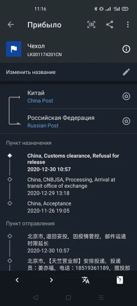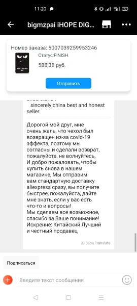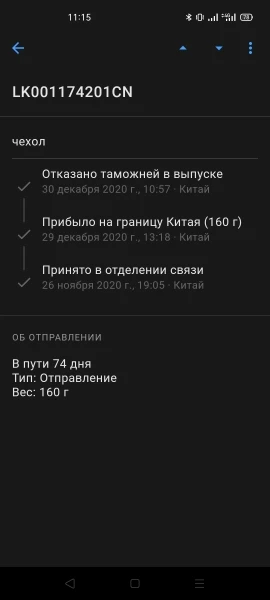 Заказал 23.11.20 в Москву, месяц чехол пролежал в сортировке перед отправкой, а когда отправили то его развернули на границе Китая, тоесть страну отправления он не покинул, связывался с продавцом и он сказал что проверит что не так, по итогу все равно пришлось открывать спор на возврат средств, но по крайней мере продавец признал что из-за пандемии чехол вернули отправителю, спор выигран, деньги вернули быстро, продавец принял мою сторону и решение Али не потребовалось, к сожалению остался без чехла, но по крайней мере продавец честный, виноватых искать не будем, деньги по спору вернули 07.02.21, ждал пока не останется день или два до конца защиты заказа, решать только вам заказывать или нет, наверно только мне так не повезло, но продавцом я скорее доволен чем нет, к сожалению без спора не обошлось но зато хорошо закончилось