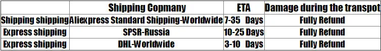 A. Все наши продукты отправляются в хорошем состоянии, специально изготовленная упаковка и повреждения крайне редки. Однако мы заменим любые поврежденные продукты, если поврежденный товар будет сообщен нам при доставке (в течение 24 часов с момента получения). Мы не можем, кроме каких-либо претензий за пределами этого срока извините.Пожалуйста, проверьте ваши товары при доставке!