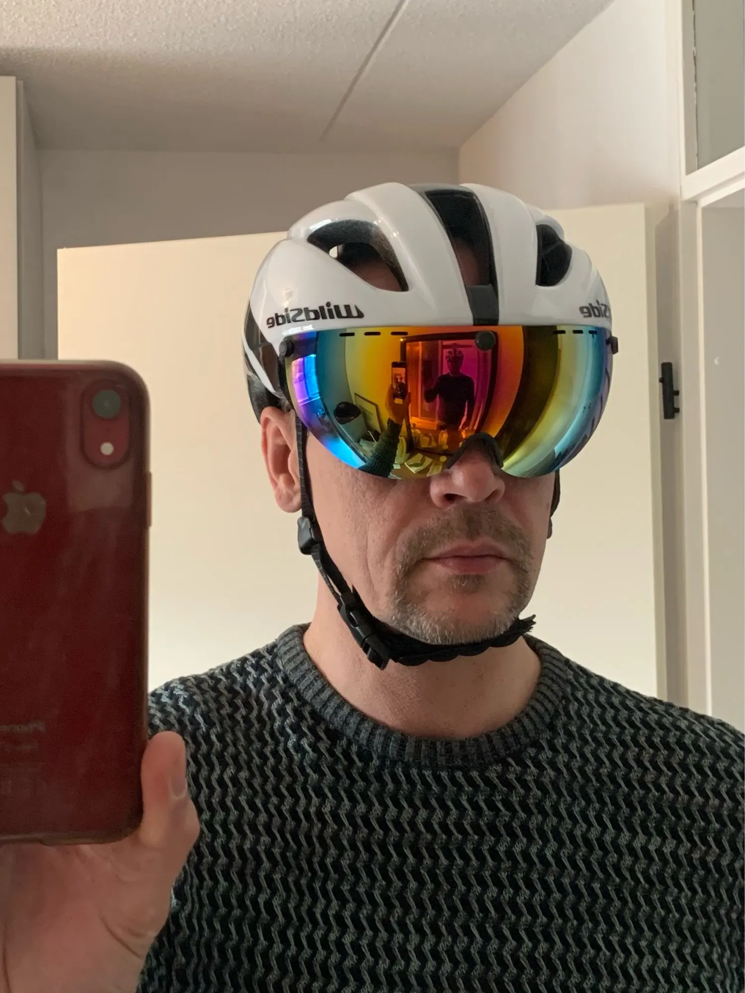 Удобный шлем с 4 различными козырьками, которые очень легко нажимаются на шлем. Козырьки идеально сидят на моих очках. Причина, по которой я купил шлем, заключается в том, что у меня нет рецепта на солнцезащитные очки. Первое впечатление очень хорошее.