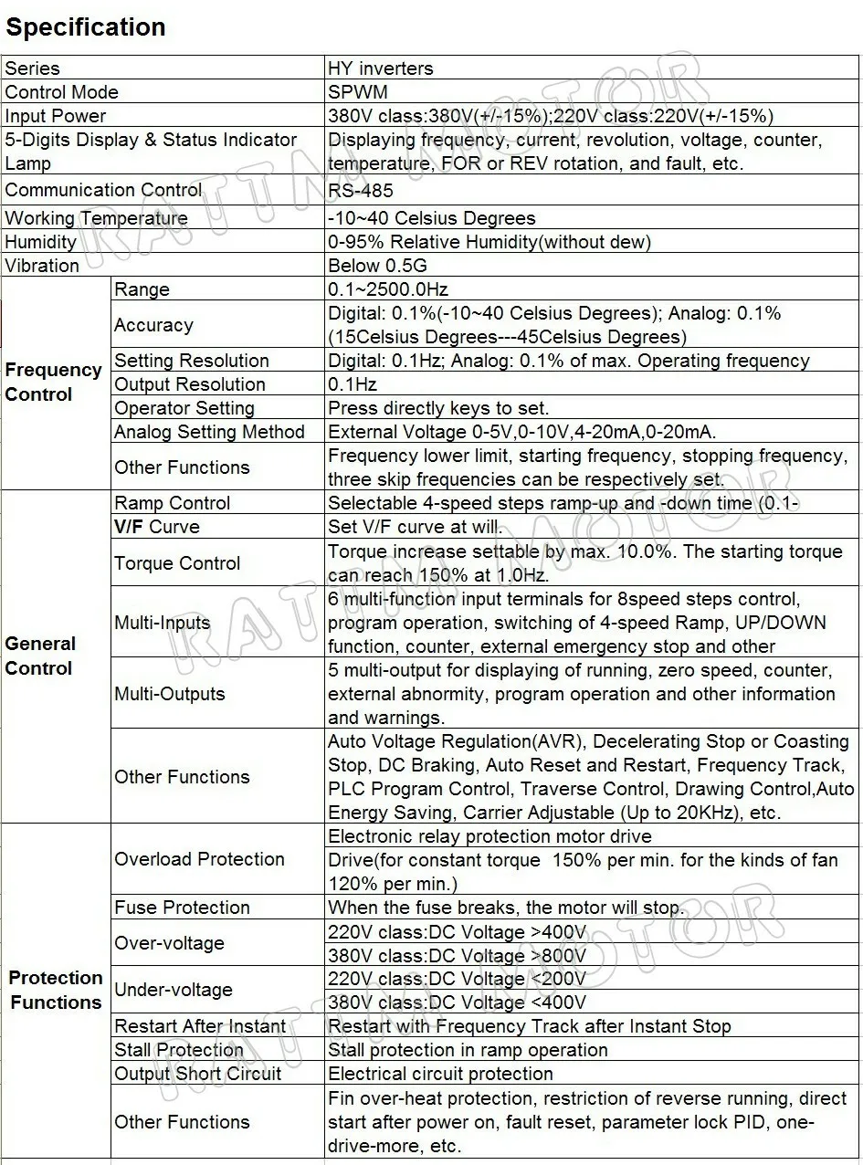 1) Входное напряжение:220V(+/-15%), Мы также поставляем 110 В (+/-15%), пожалуйста, свяжитесь с нами для товара на складе.2) Выходное напряжение:220VAC3) Входная частота: 48-63 Гц4) Выходная частота: 0-400 Гц5) Входная Фаза: 1 или 3 фазы6) Выходная Фаза: 3 фазы7) Гарантия: 1 год с даты покупки