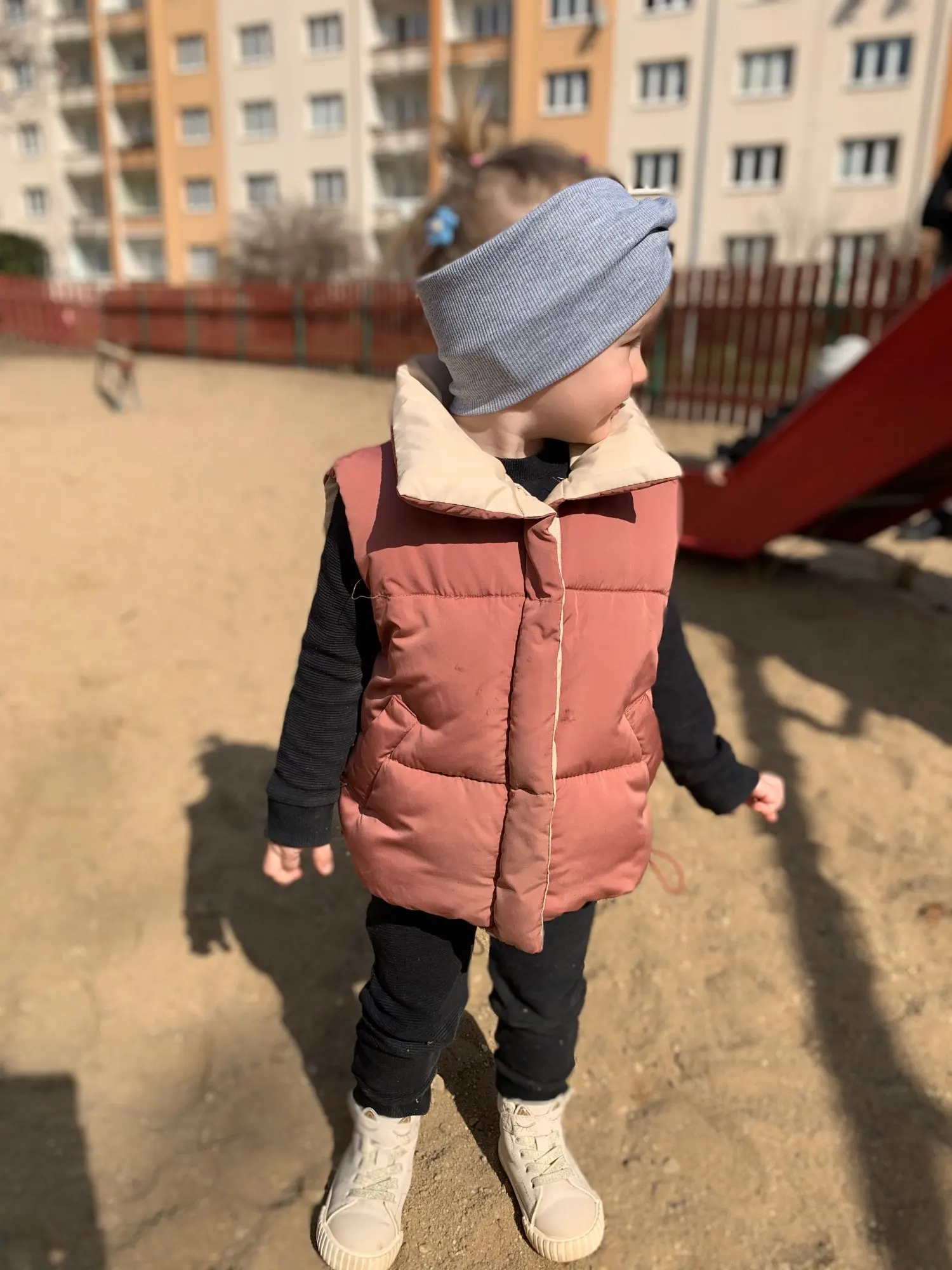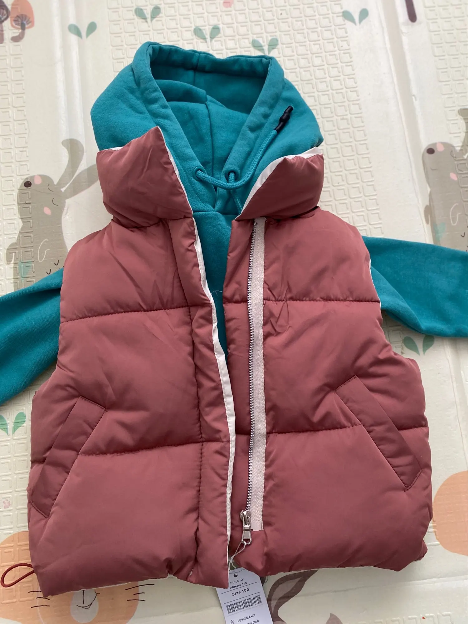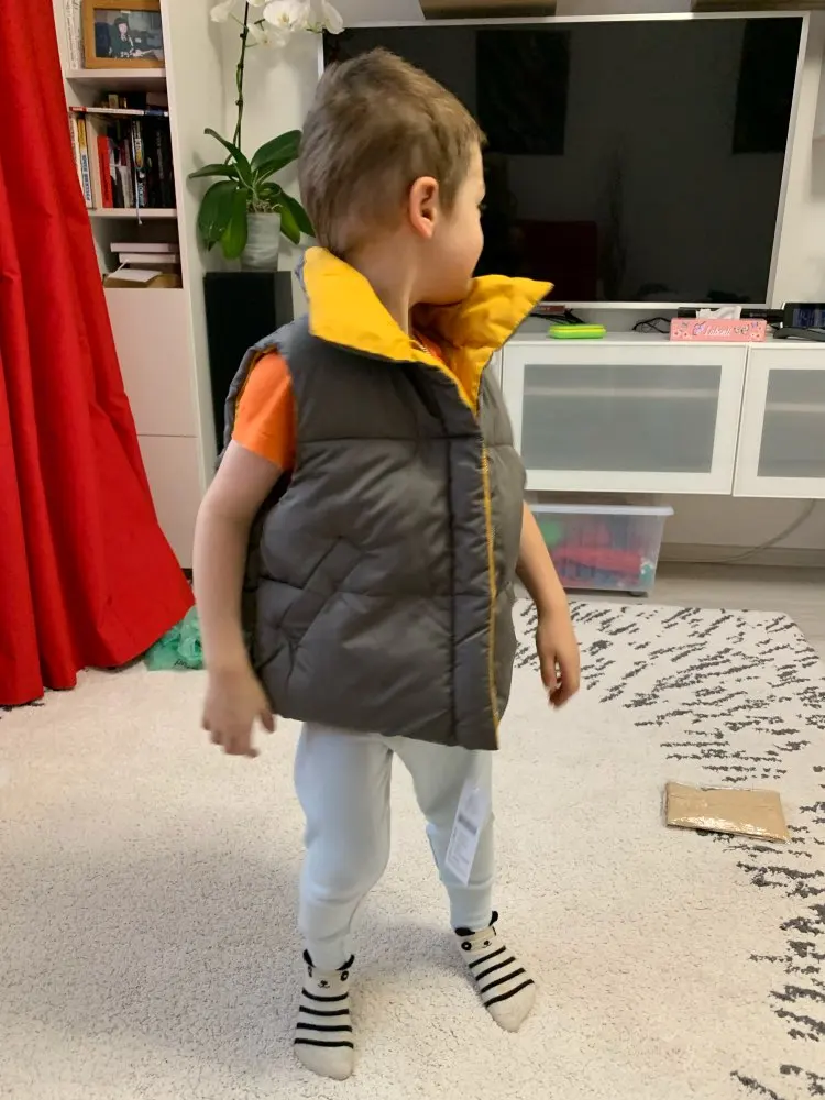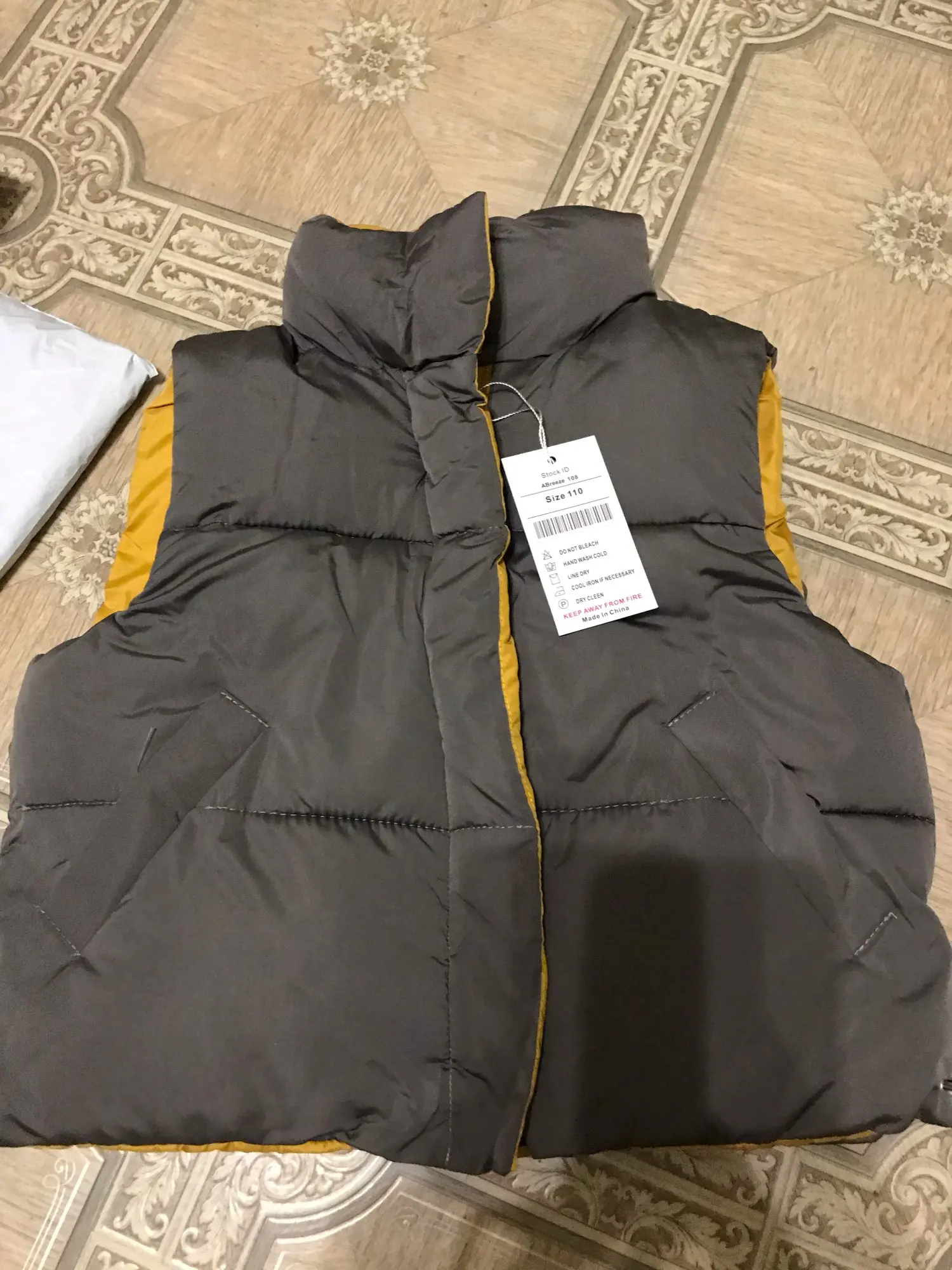 очень стильный жилет! быстрая доставка. не очень теплый, пойдет на теплую весну. маломерит. я взяла 110, у ребенка рост 90, совсем немного большеват. и то, с теплой кофтой под низ будет отлично. сшит очень качественно.