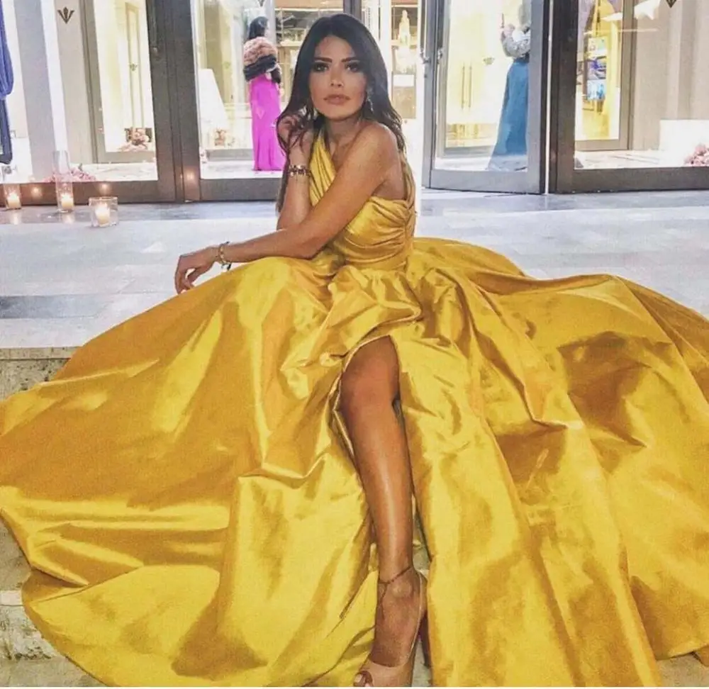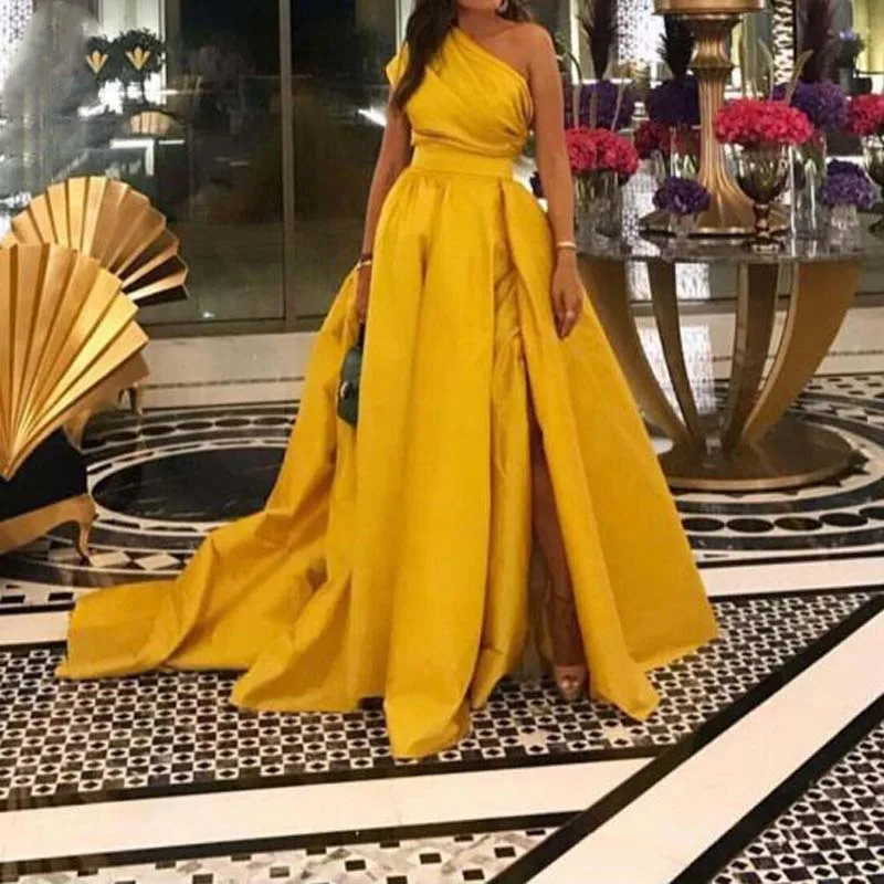 Желтые платья на одно плечо с высоким разрезом для выпускного вечера, винтажное ТРАПЕЦИЕВИДНОЕ ПЛАТЬЕ со шлейфом, официальное платье до пола, вечерние наряды на заказ, 2019