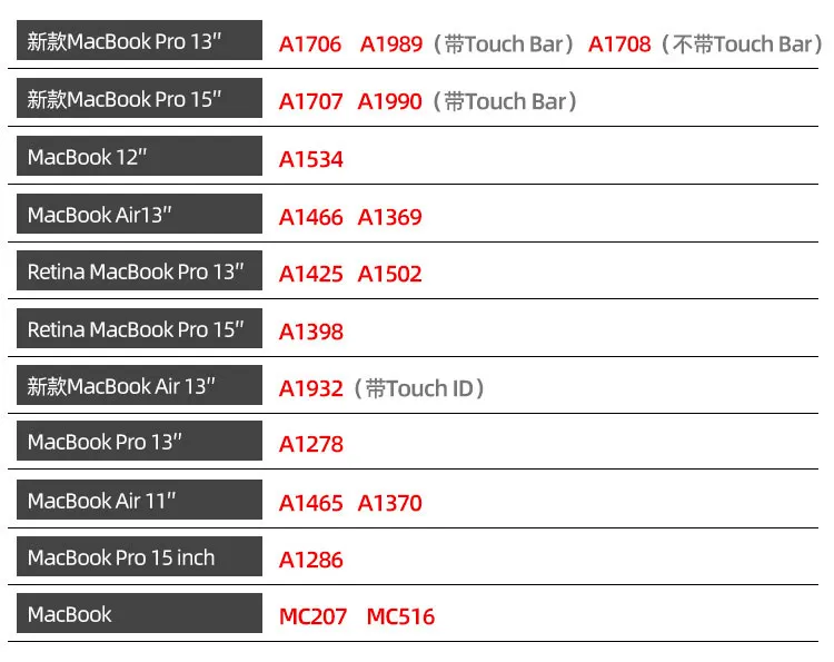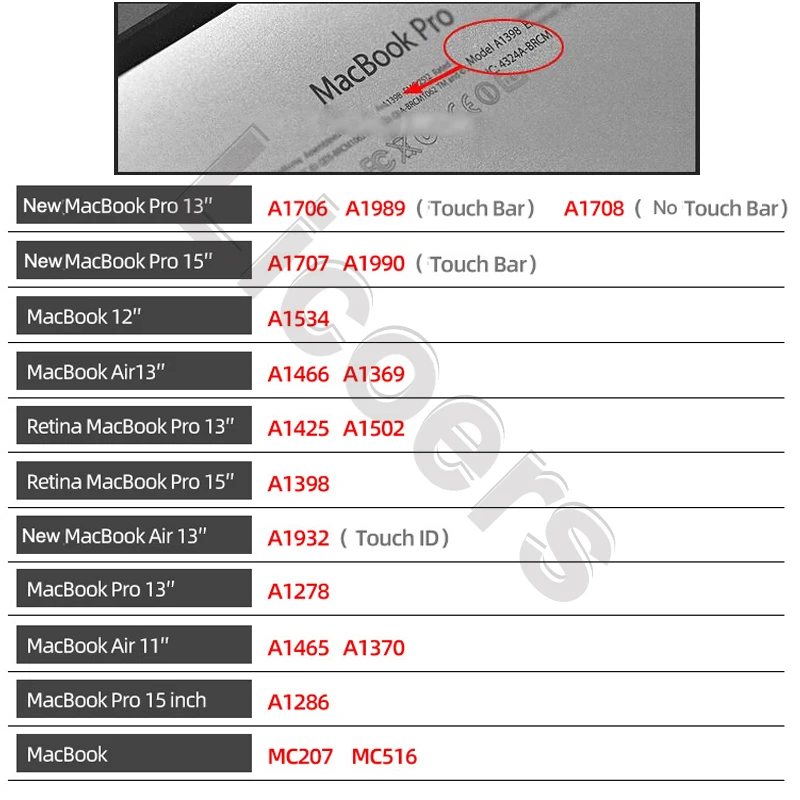 Примечание: Если вы не уверены в размере, пожалуйста, проверьте заднюю часть своей книги, вы можете увидеть напечатанную там модель (Axxxx), И тогда вы можете выбрать правильную обложку для своего mcbook с следующей таблицей сравнения, или свяжитесь с нами, мы хотели бы помочь.