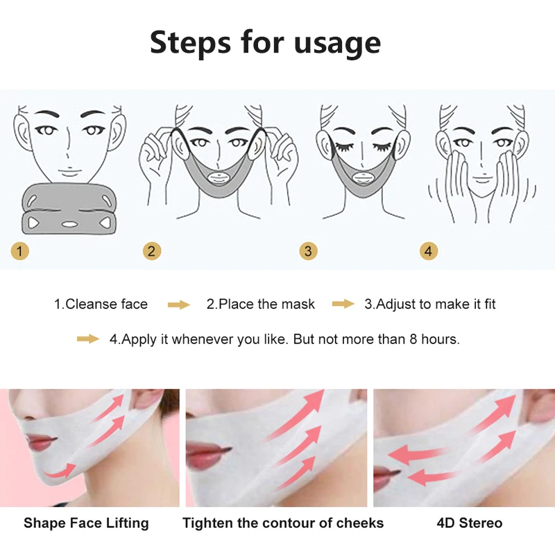 Как использовать?Очистите лицо. Нанесите тонкий слой маски на челюсть. Удлините маску и Повесьте на уши. Около 15-20 минут снимите маску. Используйте ладонь для массажа лица снизу вверх для лучшего поглощения.