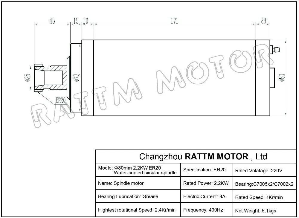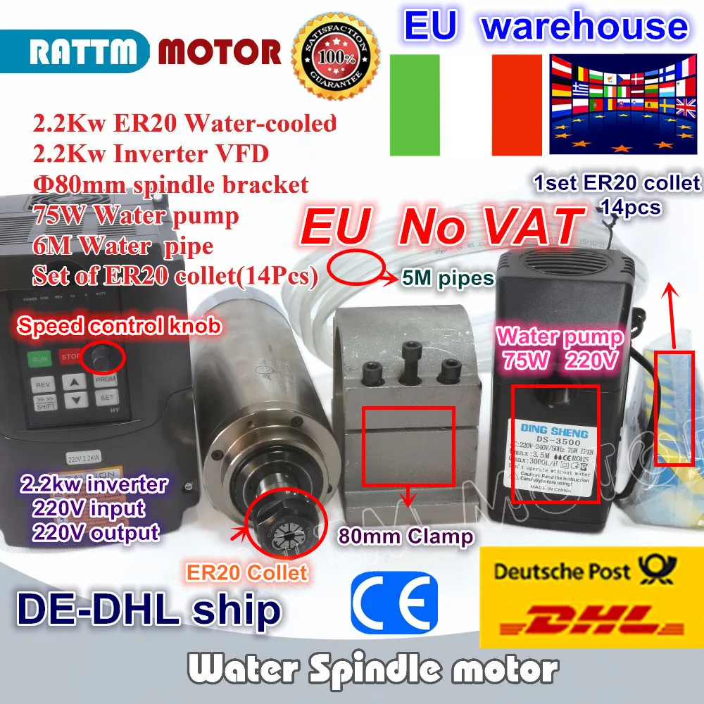 Электродвигатель шпинделя с водяным охлаждением европейского стандарта, 220 кВт, Инвертор VFD в, 80 мм, зажим и водяной насострубы и 1 Комплект цанг ER20, комплект с ЧПУ