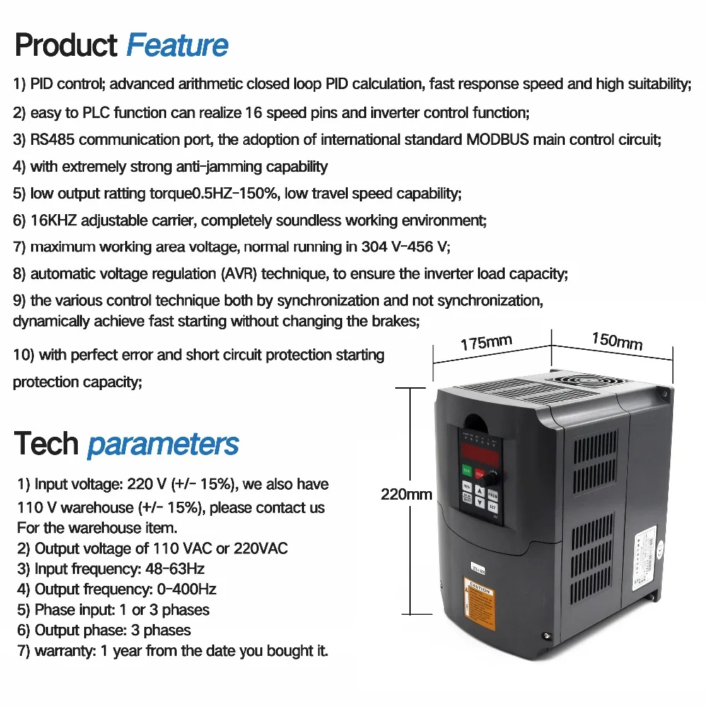 Технические параметры:1) Входное напряжение:220V(+/-15%), Мы также поставляем 110 В (+/-15%), пожалуйста, свяжитесь с нами для товара на складе.2) Выходное напряжение:220VAC3) Входная частота: 48-63 Гц4) Выходная частота: 0-400 Гц5) Входная Фаза: 1 или 3 фазы6) Выходная Фаза: 3 фазы7) Гарантия: 1 год с даты покупки