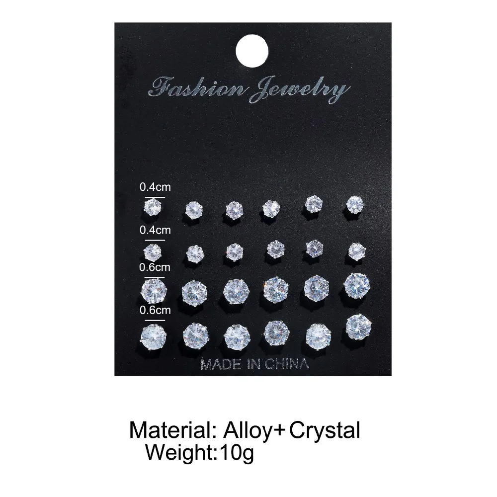 Комплект сережек для женщин и мужчин, 12 пар/карт с белыми кристаллами, серьги с прозрачными камнями, большие и маленькие