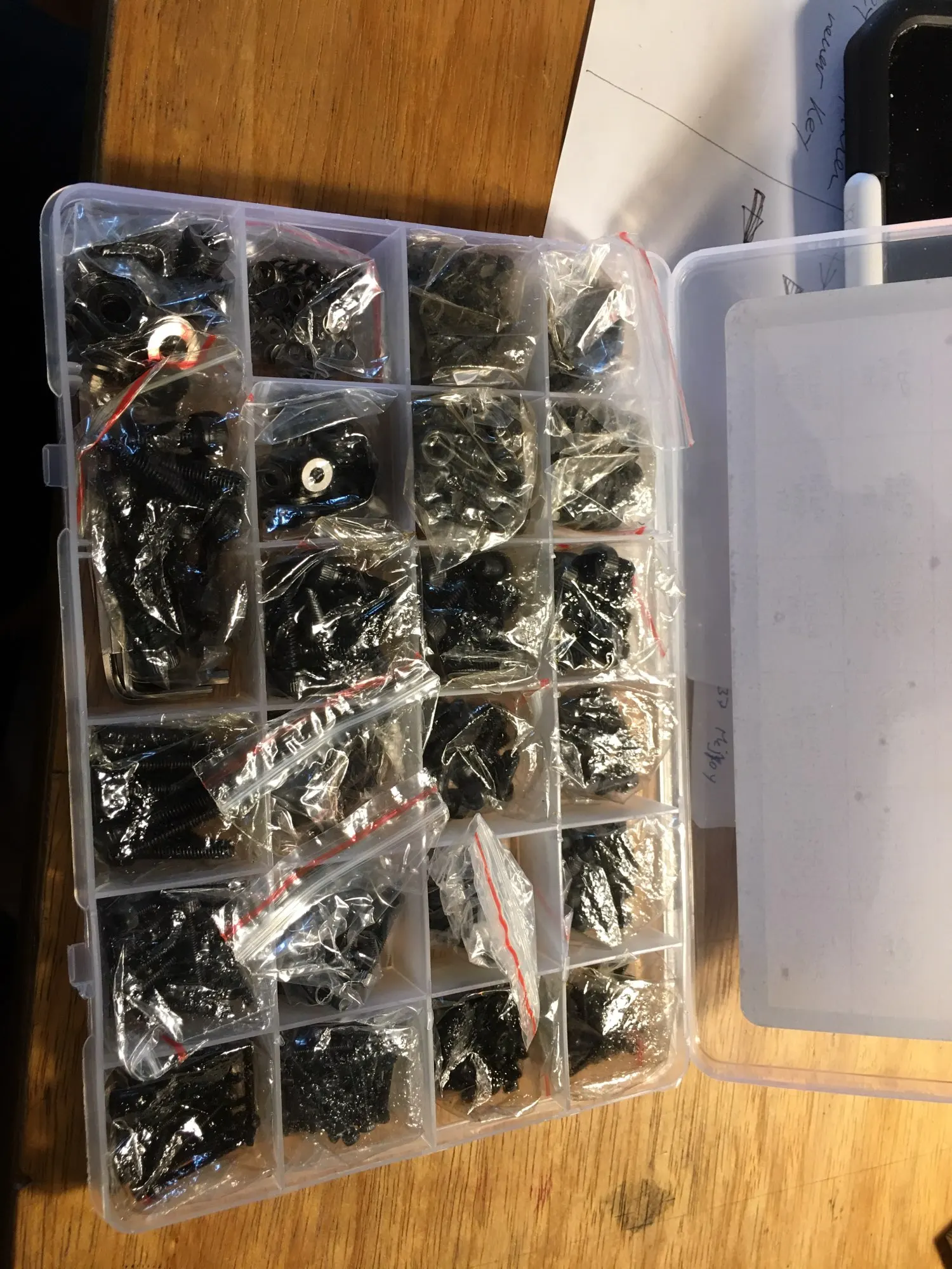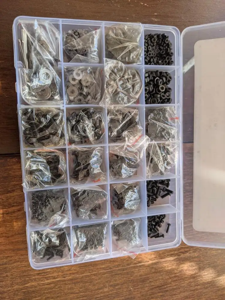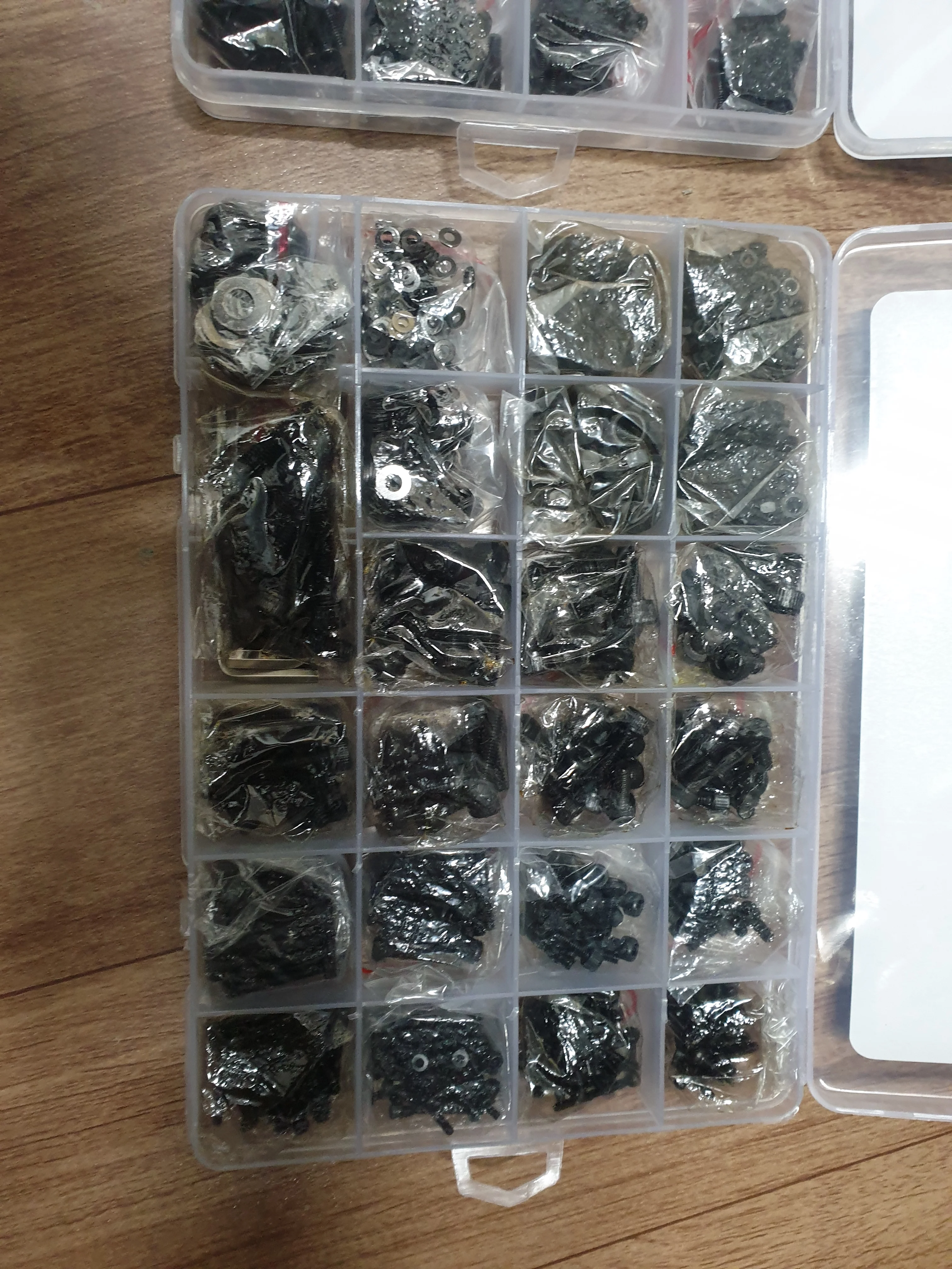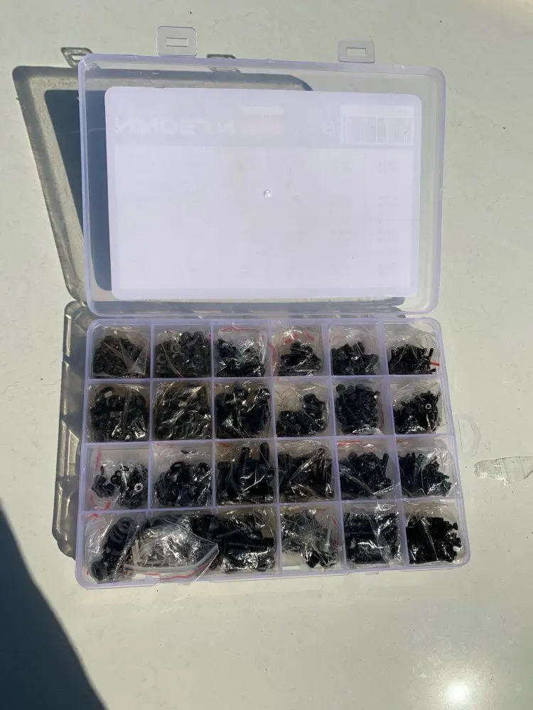 Отличный комплект! Все винты, гайки и шайбы разложены по пакетам, в смазке. Каждый набор в своем боксе. Будьте внимательны при распаковке, вытаскивайте по очереди каждый и засыпайте в тот же бокс. Иначе штангенциркуль в помощь на некоторое время ) Я не любитель выкладывать фотографии полученного в комментах, но здесь сделаю исключение. Продавец действительно подошел к делу основательно. Даже коробку закрыл скотчем, чтобы не вывалилось ничего.