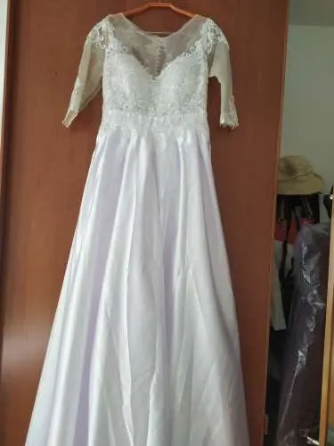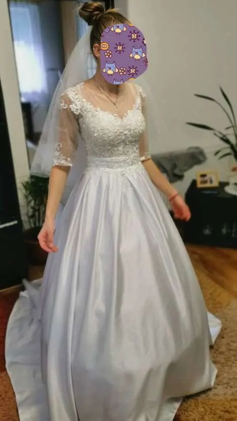Превосходное платье, плотный атлас, держит форму, есть подвес, состоящий из двойного плотного материала. Общительный прод-ц. По моему запросу отправили реальные фотографии, помогли определить размер. Платье было сшито и отправлено быстро, но не было на краю. В комплект входит кринолин, клипсы и тюль