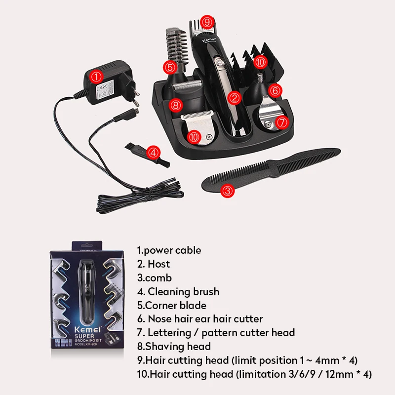 Электрическая машинка для стрижки волос Kemei 6 в 1, бритвенная машинка триммер для бороды, стрижка волос в ушах, носу, очиститель лица, инструменты для парикмахеров
