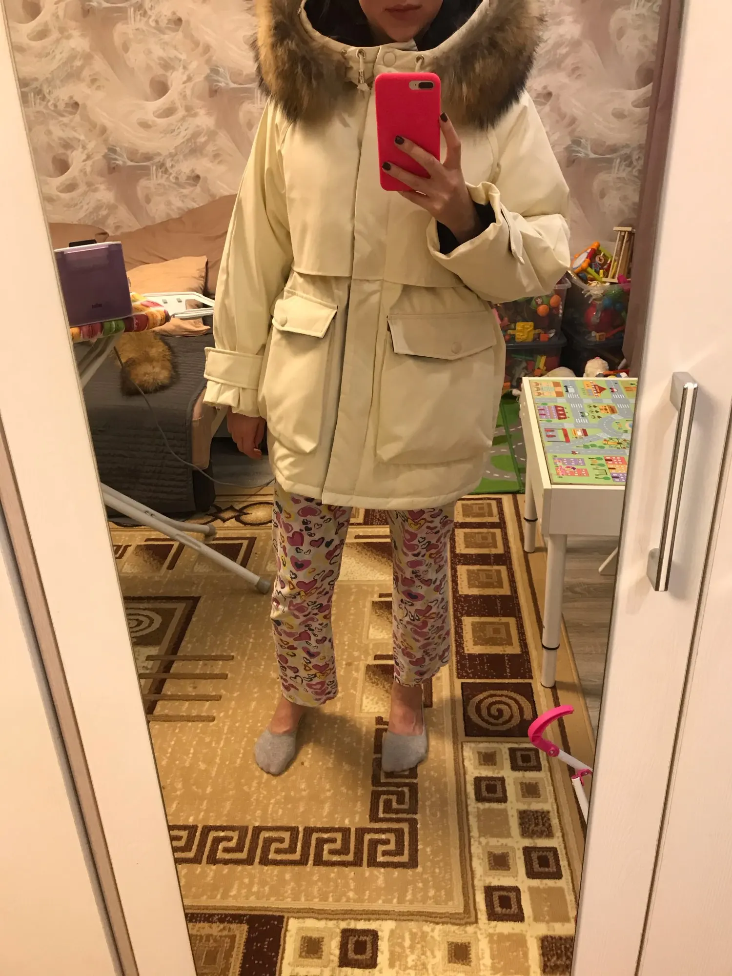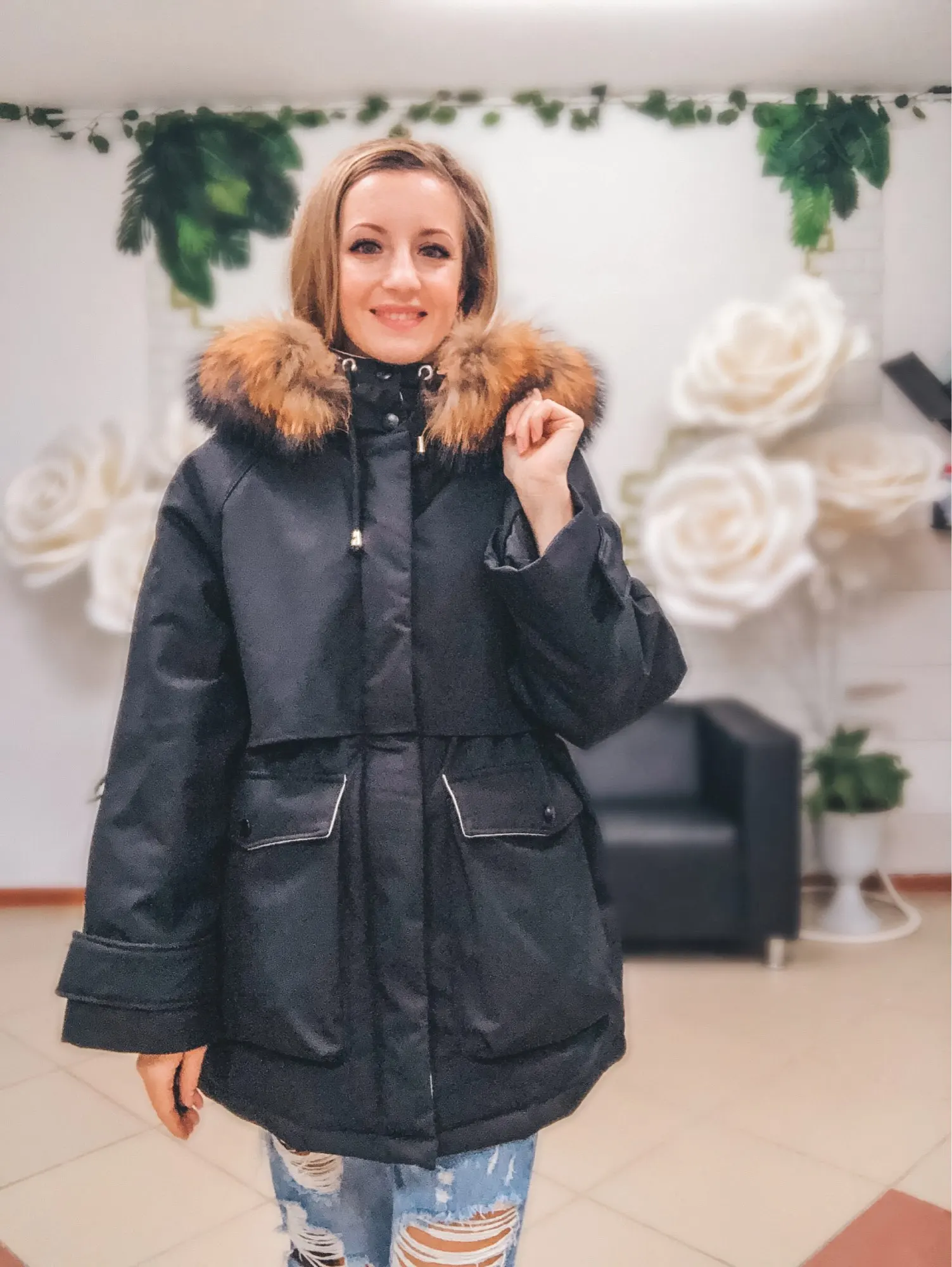 Парка понравилась. Рукава не короткие, оверсайз, смущает слишком глубокий капюшон, одеть его нереально. мех шикарный, но возникли проблемы с пуговицами на капюшоне, придется перешивать самой.