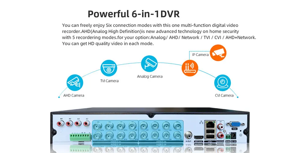 Вы можете свободно наслаждаться шестью режимами подключения с помощью этого многофункционального цифрового видеорегистратора. AHD (аналог высокой четкости)-новая передовая технология домашней безопасности с 6 режимами записи. Для вашего варианта: Аналог/AHD/Сеть/TVI / CVI / AHD + сеть. Вы можете получить видео высокого качества в каждом режиме.