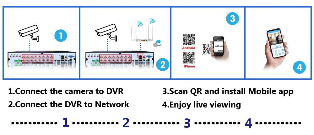 Простая настройка, всего 4 шага для просмотра мобильный телефон, просмотра видео в режиме реального времени из любого места и в любое время с помощью смартфона, стола или ПК с передовой технологией P2P, вы можете получить удаленный доступ к вашей системе за считанные минуты или меньше, нет необходимости в переадресации, удаленный доступ никогда не был таким простым!