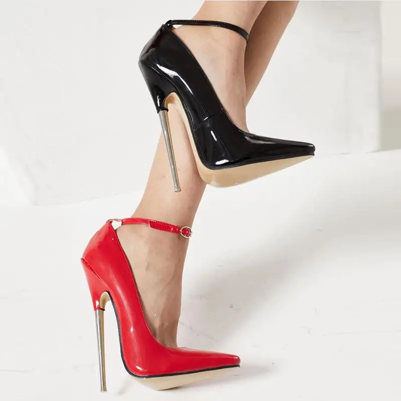 Туфли-лодочки женские, на шпильке 7 дюймов, с пряжкой, с острым носком, с ремешком на щиколотке, на тонком металлическом каблуке 18 см, красного цвета