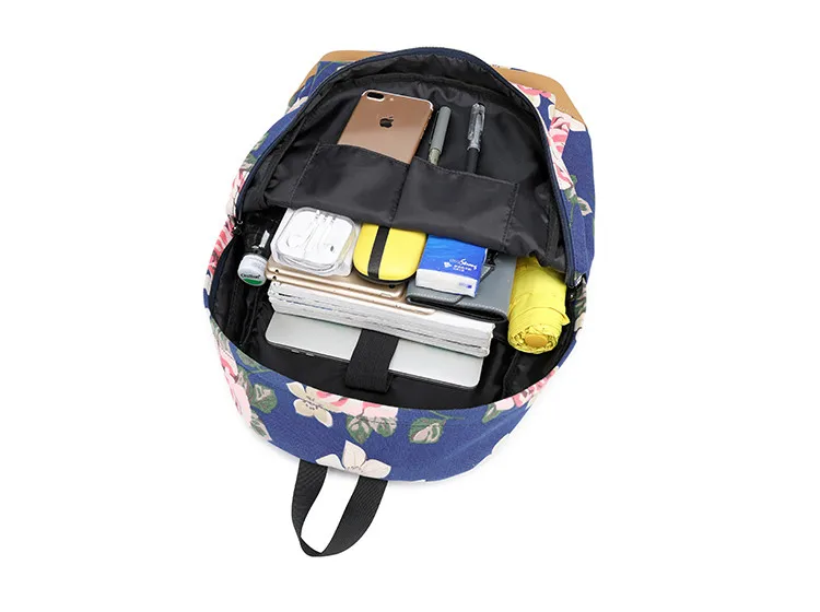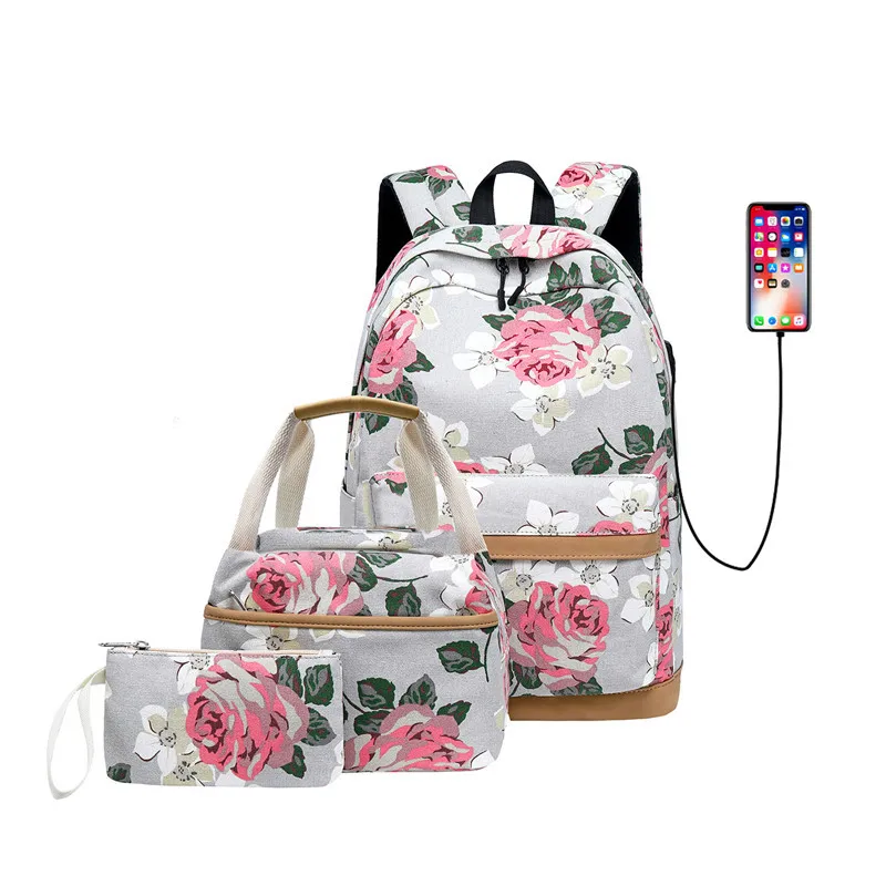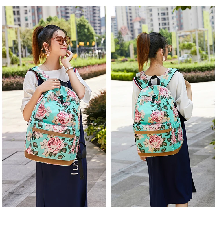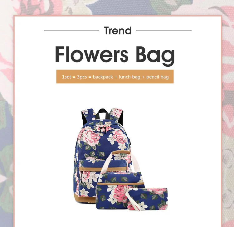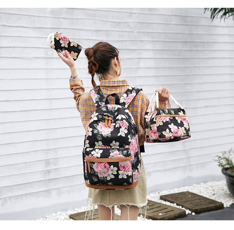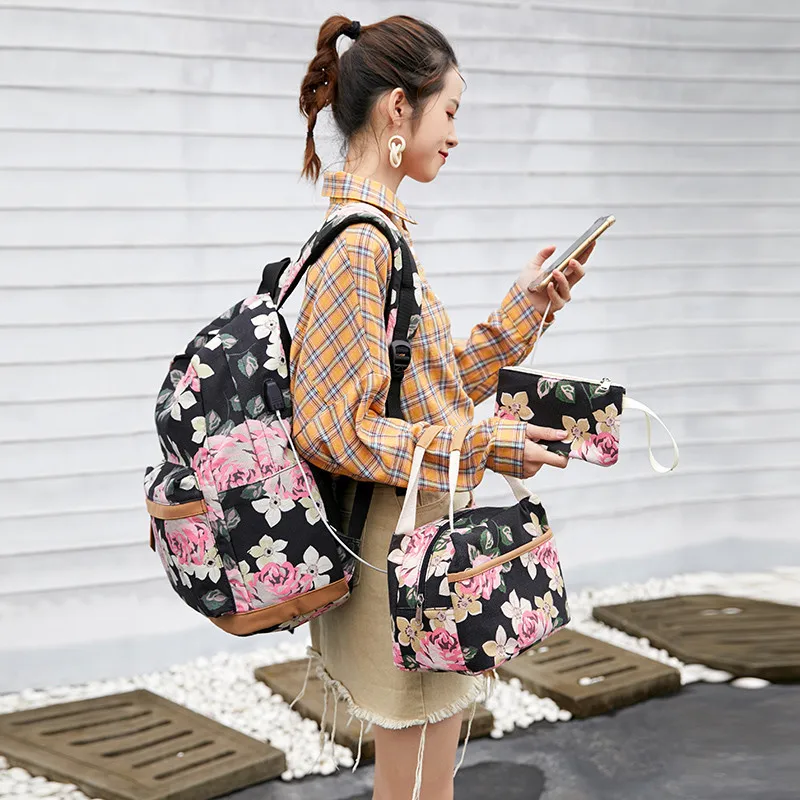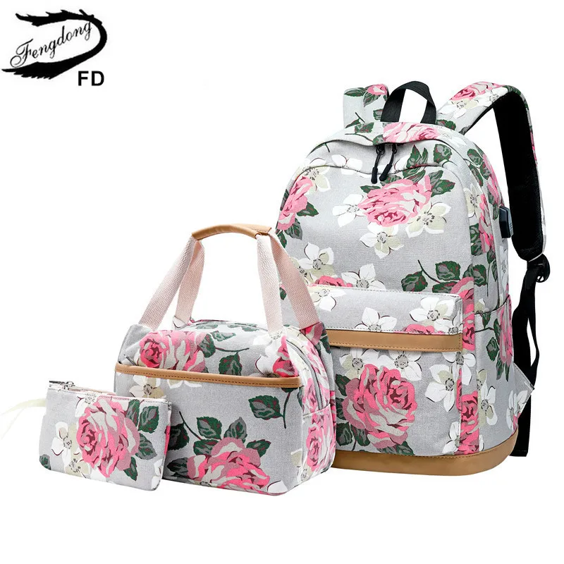 Холщовый школьный рюкзак Fengdong для девочек-подростков, 3 шт.компл., цветок в Корейском стиле