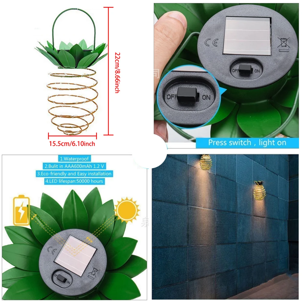 Особенности:1) светильник: новый дизайн превращает медную струну в милого ананаса, чтобы украсить вашу лозу, крыльцо, спальню, окно, балкон, стену теплой и приятной атмосферой.2) Простота использования: просто включите его, затем Повесьте на место, куда вы хотите украсить, и убедитесь, что Солнечный свет попадает. Он будет заряжаться днем и работать ночью автоматически.3) Водонепроницаемость IP45: Интегрированная конструкция не пропускает влагу через солнечные панели. Хорошая идея для деки «сделай сам» для сада, патио, свадьбы, вечеринки, рождественских украшений.4) не требует сети или проводки, изделие работает на солнечной энергии.ПараметрыНазвание продукта: Solar Iron фонарь «ананас»Напряжение 1,2 (В)Аккумулятор: 1,2 в, 600 мАчМощность источника света: 0,06 (Вт)Цвет: теплый белыйУровень защиты: IP45 водонепроницаемыйПараметры солнечной панели: 30*30 Аморфный Кремний 2 в 40 мАСветодиодные фонари: 24 теплых белых медных фонаряРазмер продукта: 15,5 см * 15,5 см * 22 см (включая портативный)Посылка:1 шт/2 шт Солнечный Утюг фонарь «ананас»