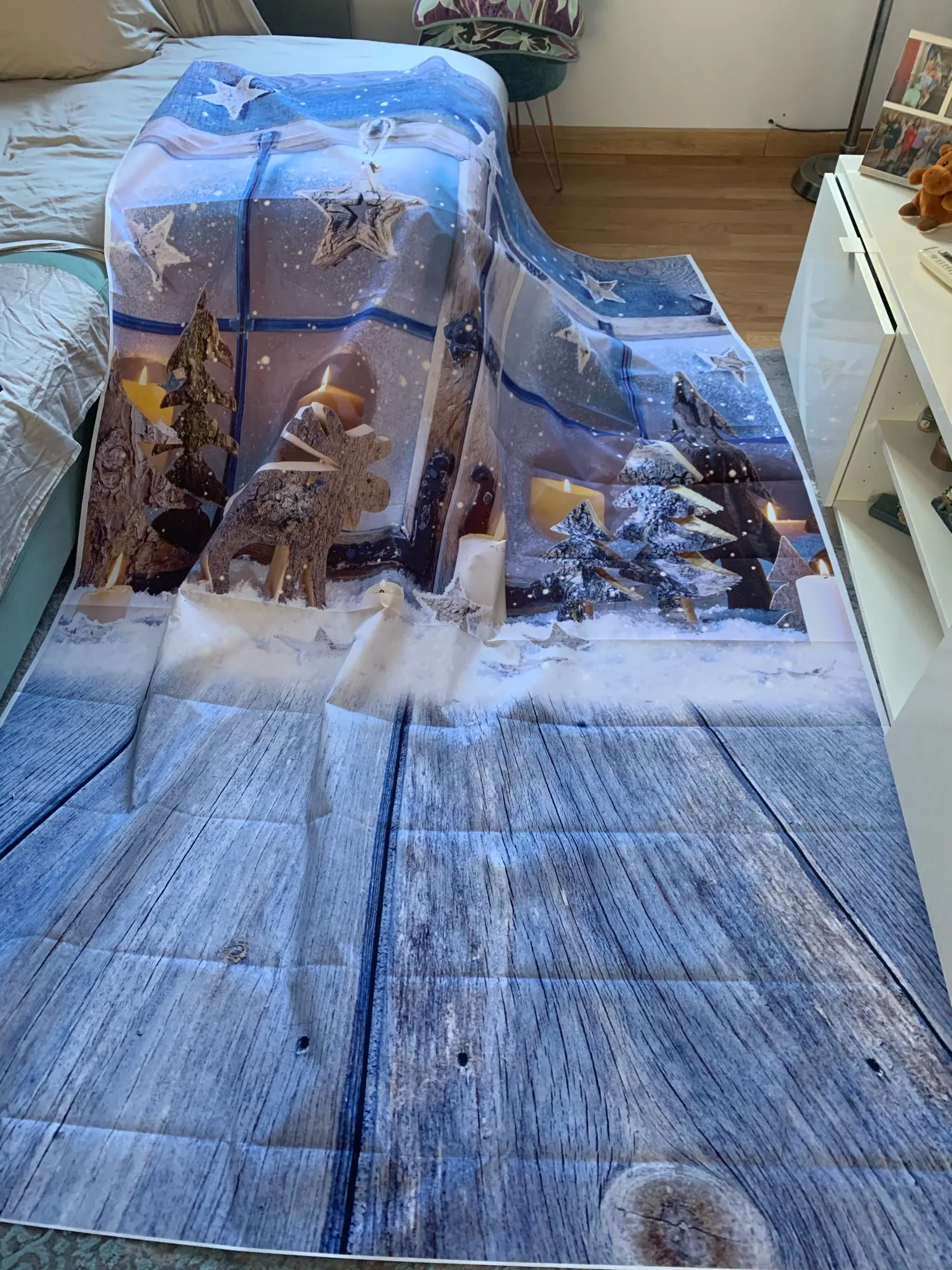 Доставка очень порадовала , быстрая . Качество печати бледновато , но соответствует цене . Швы разглаживаются , но надо приложить усилия, у меня размер 2000х3000 см, и руки очень быстро устали гладить швы . Сделала из отрезков ватмана тонкую и долинную трубочку , намотала на неё фон , посмотрим может полежит расправятся швы лучше ( хотя на фото их уже и не видно ) . Ну или после повторного глажения будут совсем незаметны .
