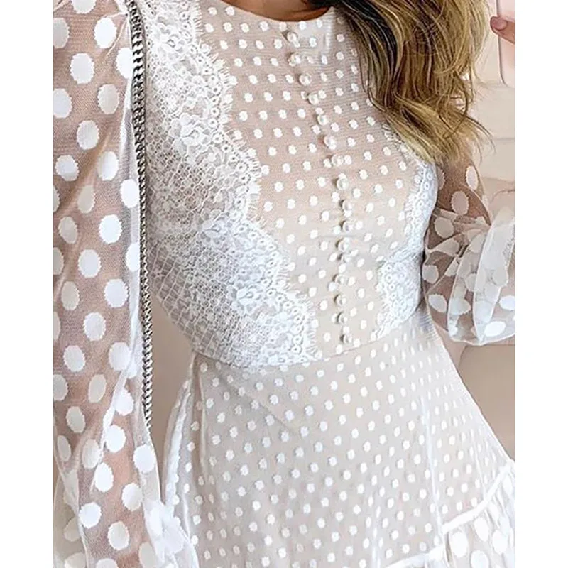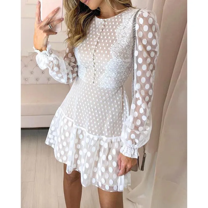 Женское Сетчатое кружевное платье в горошек, элегантное ТРАПЕЦИЕВИДНОЕ платье-рубашка с длинным рукавом и оборками на подоле, осень 2019