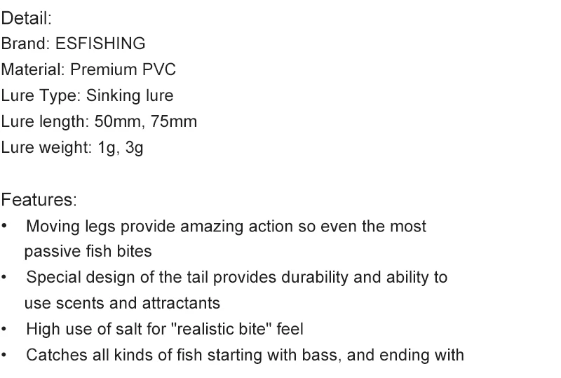 Приманки мягкие и с аттрактантом. У меня есть некоторые ларвы от Fanatik-я могу сказать, что приманки ESFishing лучше подходят для моих потребностей и ожиданий. Продавец был отзывчив и разобрал проблему с доставкой, которая была возвращена перевозчиком.