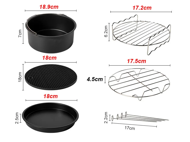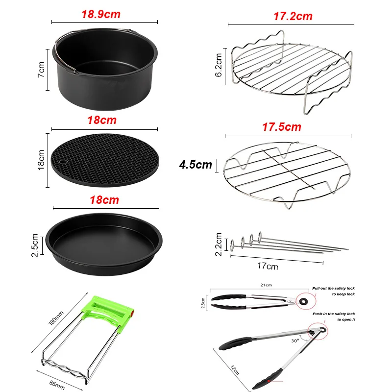 Высокое качество воздуха фритюрница аксессуары 7 дюймов для Gowise Phillips Cozyna и Secura, набор из 7, подходит для всех Airfryer 3.7QT - 4.2QT - 5.3QT - 5.8QTПредотвращение ожогов-предоставление зажима для чаши и кухонного Тонга для безопасного подъема горячих тарелок и стеллажей из воздушной фритюрницыВысокое качество-сделано из пищевых материалов безопасности, покрытие для здоровья тефлоновое антипригарное покрытие, которое легко чистить и долговечно100% совместимость-этот универсальный набор аксессуаров для воздушной фритюрницы подходит для всех стандартных воздушных фритюрниц (3,7qt) для воздушных фритюрниц XL (5,8qt). Не волнуйтесь, это идеальный размер, такой как Cozyna, Philips, Gowise и другие воздушные фритюрницыРасширьте свой опыт выпечки и приготовления пищи-испечь ваш любимый торт в бочке торта, готовьте вкусную пиццу в сковороде для пиццы, увеличьте свою поверхность для приготовления пищи с помощью металлического держателя и сделайте шашлыки с помощью многоцелевой стойки! И поверх этого, Защитите ваши домашние поверхности с помощью силиконового коврикаДля моментального расширения выпечки рецепты с этим non-slip ГЛУБОКАЯ ТАРЕЛКА выпечки лоток, который позволяет испечь торт, хлеб, Киш и многое другое в быстром, легкий и здоровый образ жизни (17,8*7,4 см)Он также имеет ручку, что позволяет легко поднять и удалить из airfryer. При удалении тарелки из фритюрницы всегда используйте термозащитную ткань.Вы можете использовать его, чтобы сделать блинчики, яйца, картофель, кесадиллы или даже гигантское печенье! С воздушной фритюрницей аксессуары для гриля, возможности безграничны! (17,8*2,5 см)Увеличьте поверхность готовки с помощью металлического держателя. Просто приготовьте свою еду по желанию и поместите один слой пищи в корзину фритюрницы, как обычно. Далее place this металлический держатель сверху и наконец-то Добавьте второй слой пищи на металлической решеткой.(17*4,8 см)Двойная стойка для приготовления шашлыков может действительно максимизировать вашу поверхность для приготовления воздушных фритюрниц. Он обеспечивает больше места, а также позволяет жарить больше пищи в одном ходу (18*18*7 см)Силиконовый коврик обеспечивает вам термостойкую поверхность, чтобы разместить ваши горячие аксессуары. Применение в духовка Сейф перчатка для того, чтобы удалить ваш аксессуар из аэрофритюрница для приготовления блюд без и поместите его на силиконового мата (17,8*0,7 см)Цвет: черный, серебристыйМатериал: нержавеющая сталь из углеродистой сталиПосылка:1 * бочонок для торта1 * кухонный зажим (случайный цвет, не может быть выбран.)1 * зажим для тарелки1 * сковорода для пиццы1 * металлический держатель1 * полка1 * силиконовый коврикТолько вышеуказанная посылка, другие товары не включены.Примечание: светильник и различные дисплеи могут привести к тому, что цвет товара на картинке немного отличается от реального. Допустимая погрешность в измерениях-1-3 см