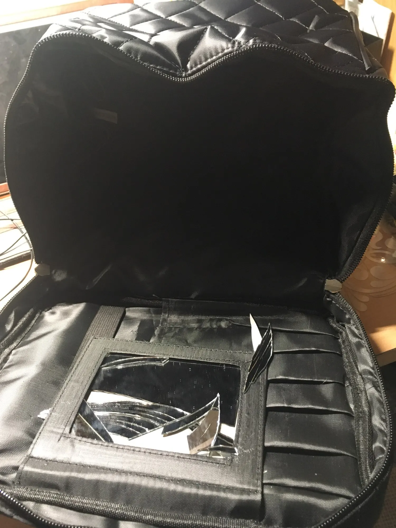 Пришло с разбитыми зеркалом!!! Я покупала эту косметичку из за зеркала и в итоге,что мне с этой косметичкой делать??? Халатное отношение к покупателям!!! Ведь можно было бы так упаковать посылку,чтобы не разбилось зеркало! А продавец просто положил и в итоге ,разбитое зеркало!!! А косметичка ведь не дешевая!