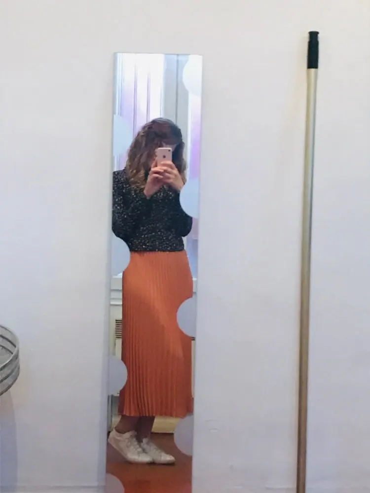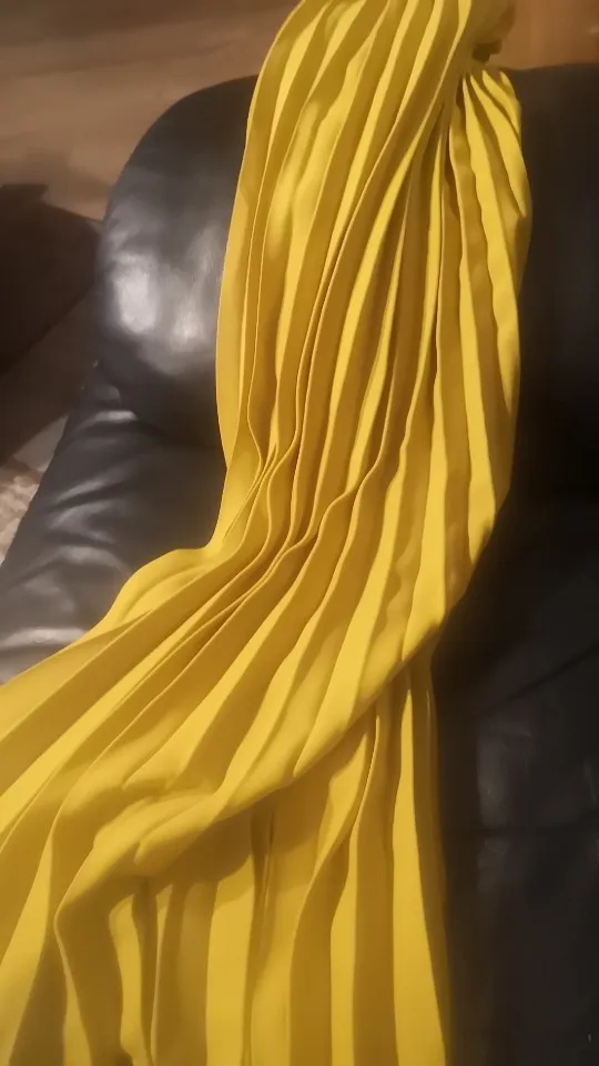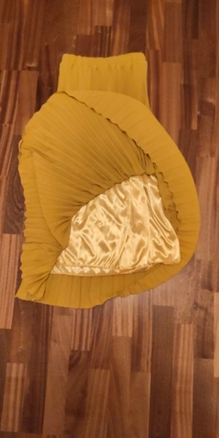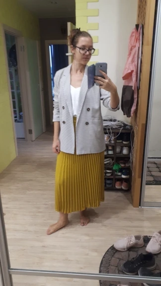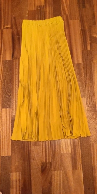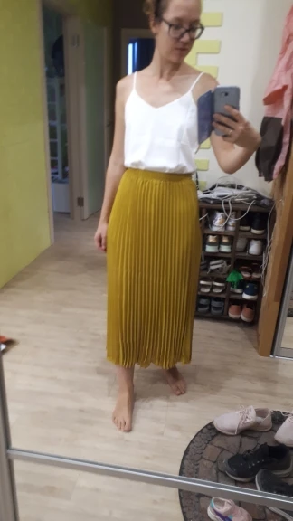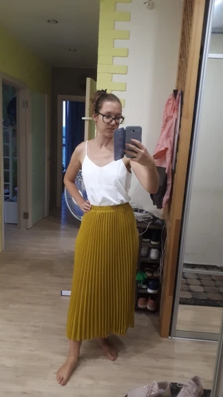 Отличная юбка! Очень круто, что есть 2 варианта длины! Мне все короткое всегда (рост 176см), а тут полноценное миди. Цвет желтый - землистый, немного как горчица. Отпарила утюгом вертикально, в одном месте переборщила немного, складки чуть расправились, так что с этим осторожнее. Параметры: талия 74, бедра 104, рост 176