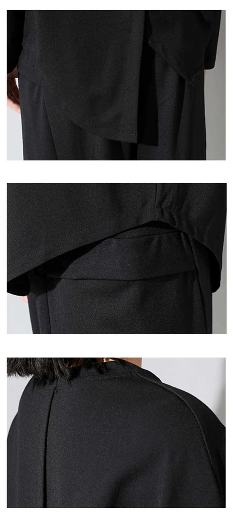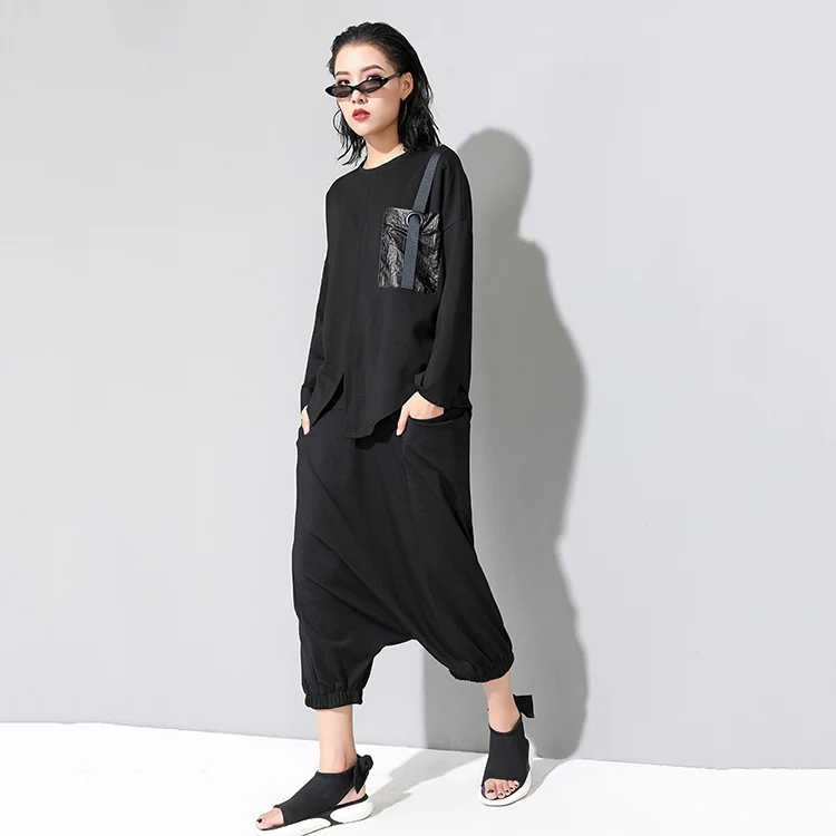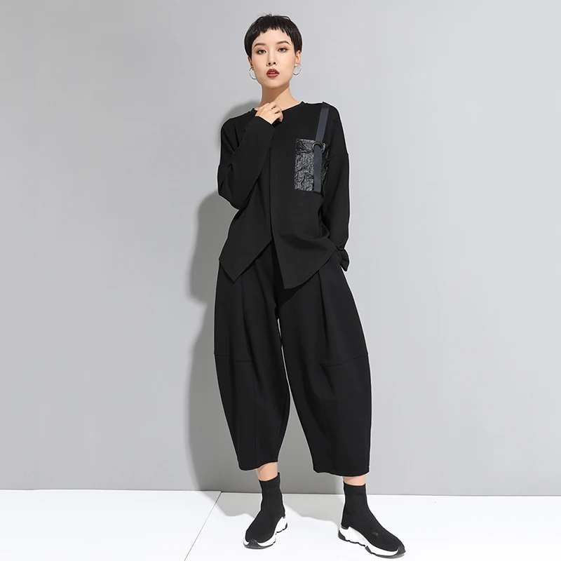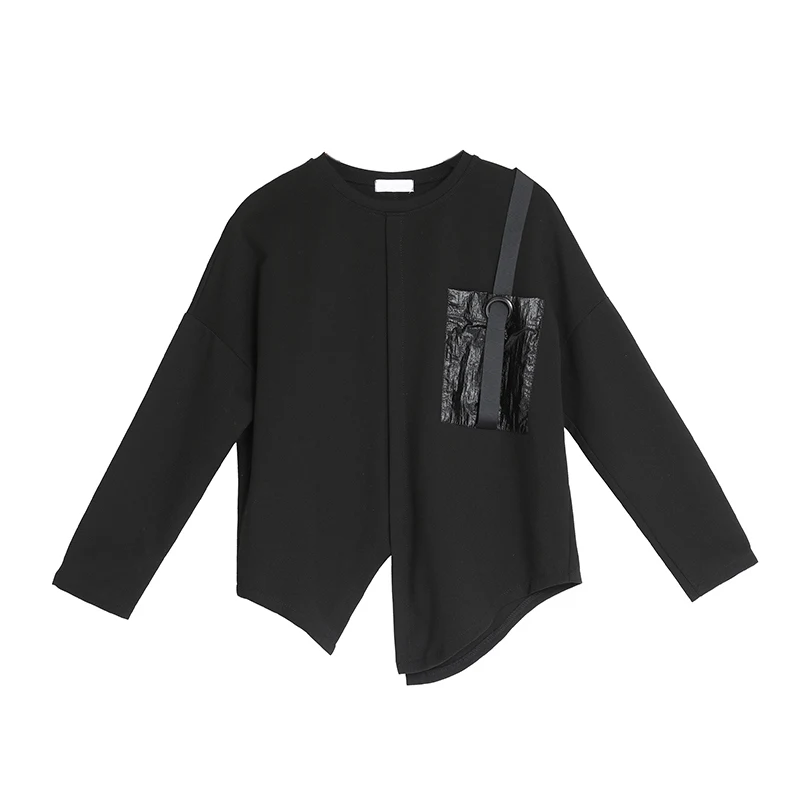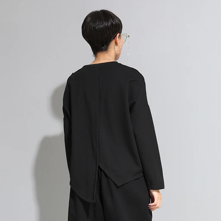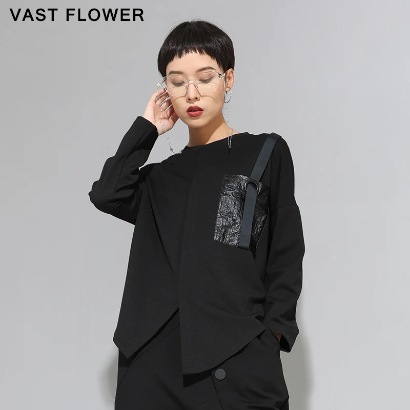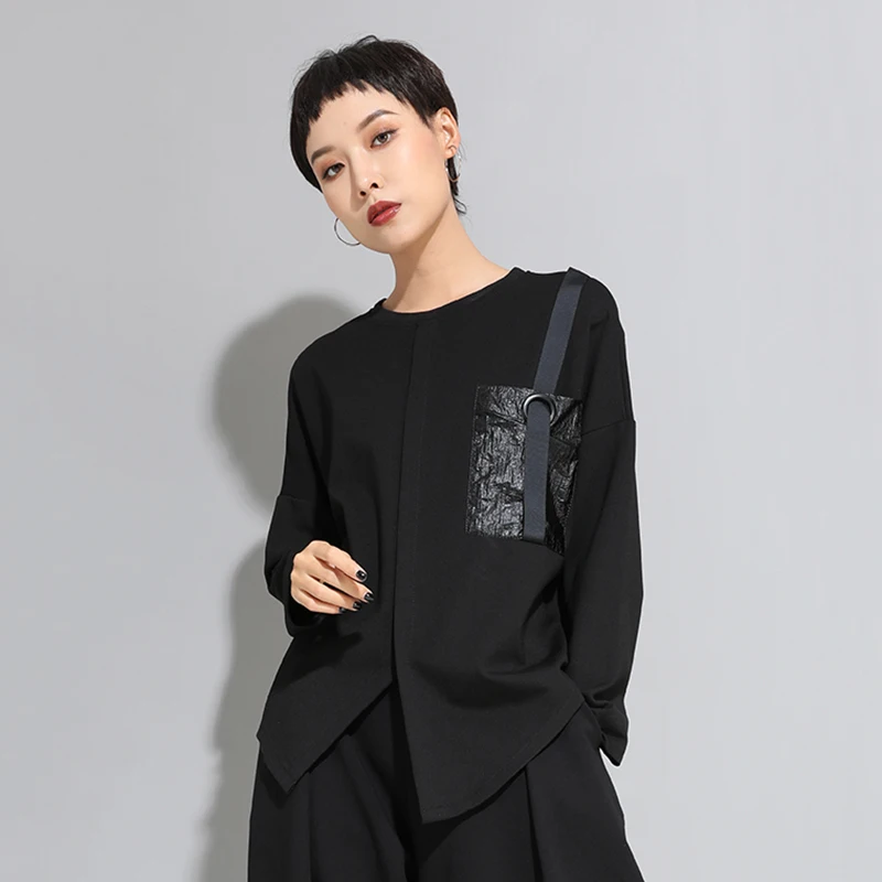 Женская Асимметричная футболка с разрезом, черная свободная футболка с круглым вырезом и длинным рукавом, с карманами в стиле пэчворк, модные топы, весна-осень 2021