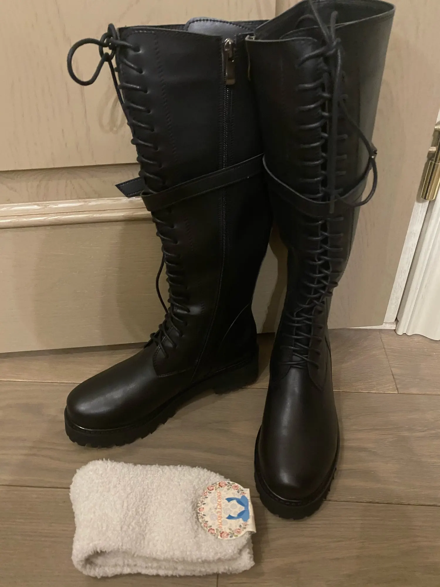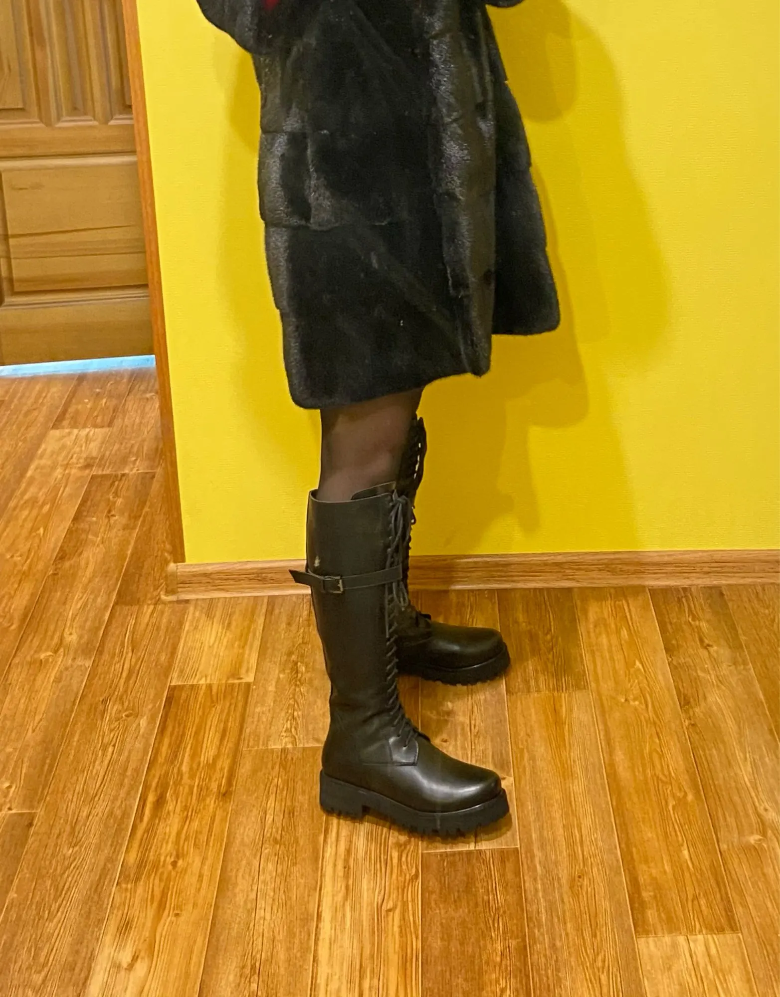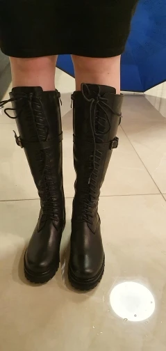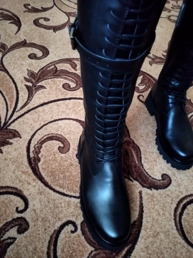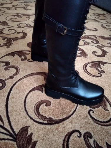 Суперские сапоги! Пришли очень быстро, упакованы отлично, ничего не помялось. На мою широкую ногу, стопа 25,5 размер 9,5 подошёл хорошо, правда, на тонкий носок. Шнуровку можно подогнать под полноту ноги. Сапоги высокие, удобные, мягкие, продавец еще в подарок положил очень теплые, мягкие носки, заколку и какую-то пахучую штучку :) Короче, я очень довольна, рекомендую!!!